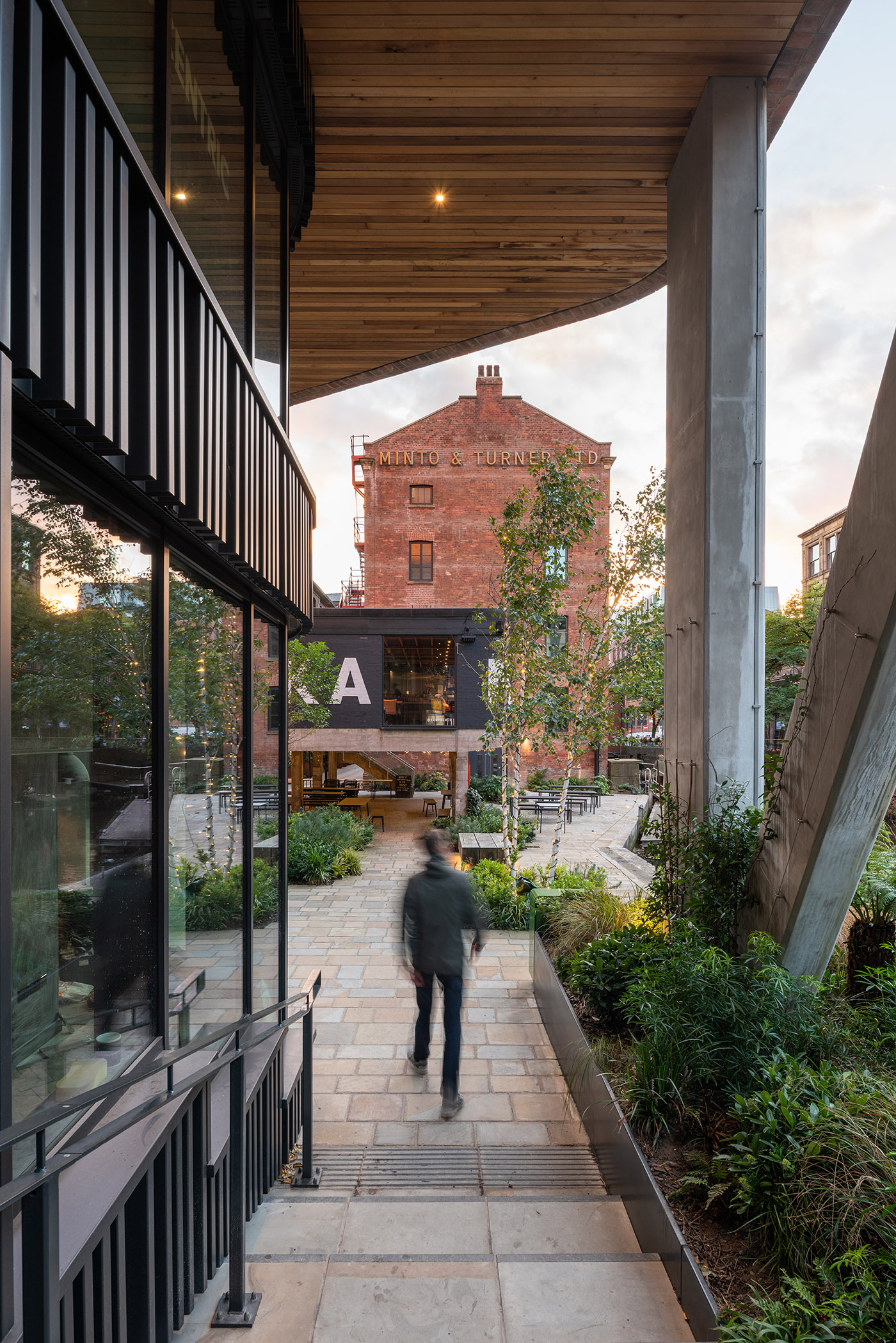 A livello orizzontale, gli edifici sono divisi in tre elementi: un podio con rivestimento metallico e profilo scuro, una sezione con mattoni rossi a trama grezza e un tetto rivestito anch’esso da metallo profilato. Il podio a piano terra crea un bordo definito dalla strada