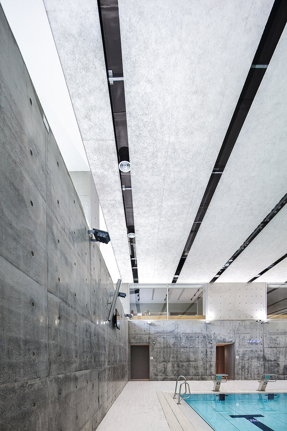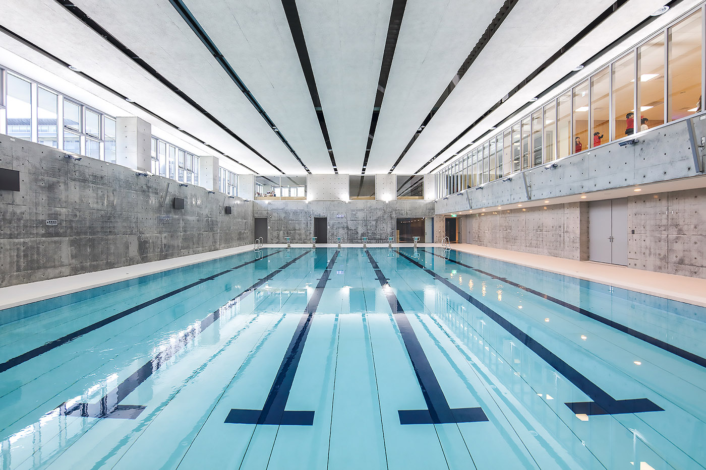 Lo spazio della piscina è trattato con materiali di colore fresco per essere in accordo con l’azzurro della piscina. Il soffitto è stato ideato con materiali idonei per assorbire il suono mentre altre superfici riflettono, permettendo al suono dell'acqua di riverberare deliberatamente all'interno dello spazio. Al contrario, la palestra è trattata con materiali di colore toni caldi che riecheggiano l'energia del corpo e il calore generato dalle attività sportive. La piscina è progettata con una piattaforma a pavimento mobile che cambia profondità da 0 a 200 centimetri per ospitare studenti di varie età