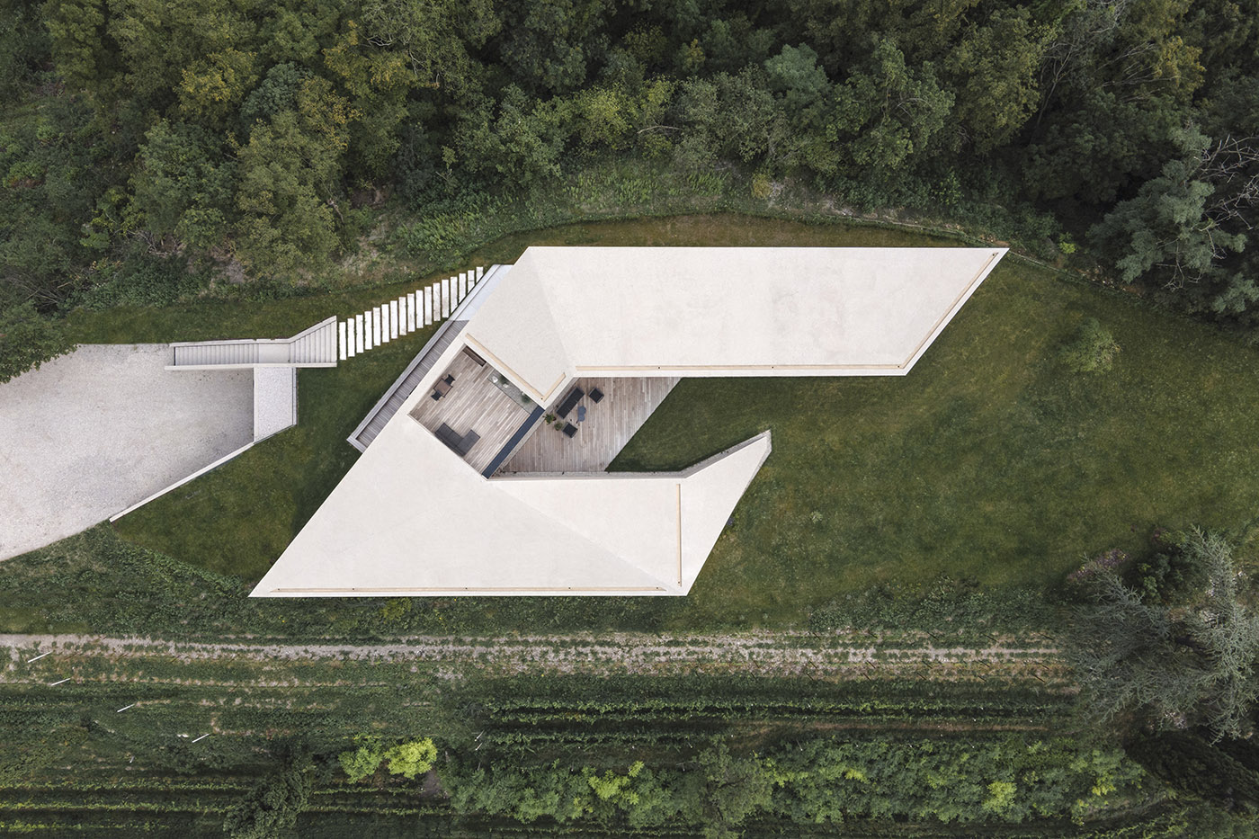 L’architettura della villa Kastelaz Hof crea una transizione fluida e armoniosa con il paesaggio ed è appena percettibile dal vicino villaggio. La struttura a nastro che emerge dal paesaggio naturale crea un cortile interno che offre protezione dal forte vento proveniente dal Lago di Garda. La materialità esterna riproduce i muri di contenimento esistenti dei vigneti circostanti, realizzati in Chalkstone, rispecchiando la loro stessa consistenza e colore