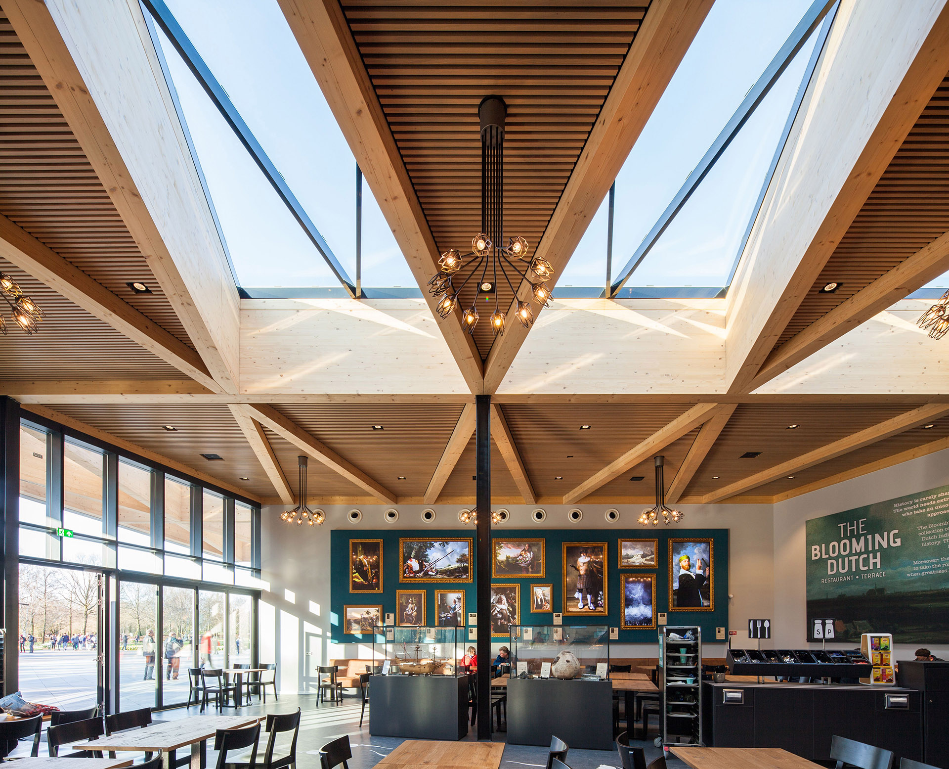 Nello spazio di passaggio, guardando in alto il cielo olandese appare incorniciato da triangoli in legno, il pavimento è caratterizzato da ombre triangolari mentre, guardando diritto a sè, una recinzione a motivo di tulipano segna l'inizio dell'area del parco