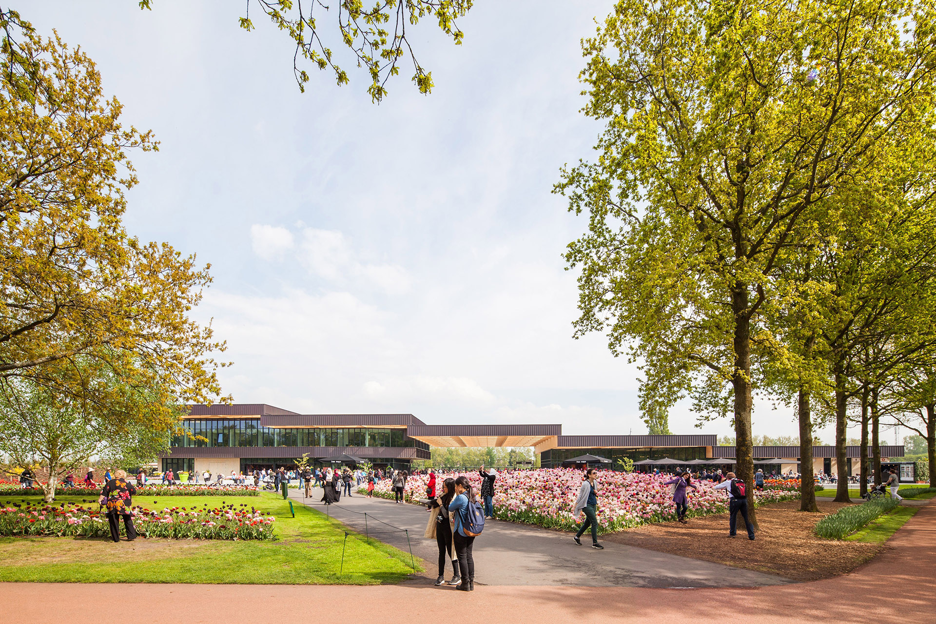 Keukenhof, parco botanico olandese di fama mondiale, grazie al progetto dello studio Mecanoo architecten, gode di un ingresso principale maestoso. Un sorprendente tetto in legno poggia su due volumi, creando così un accesso maestoso al parco