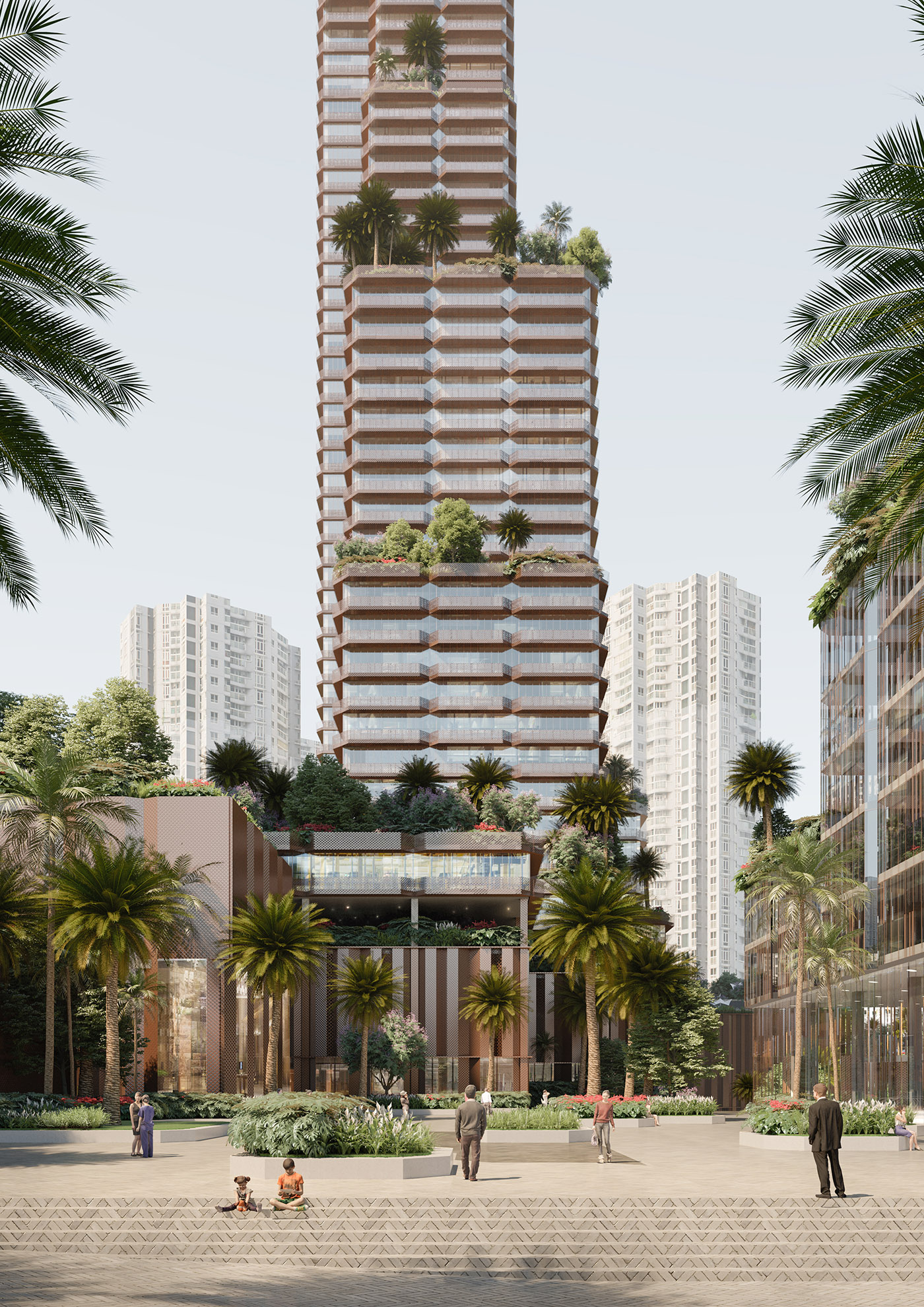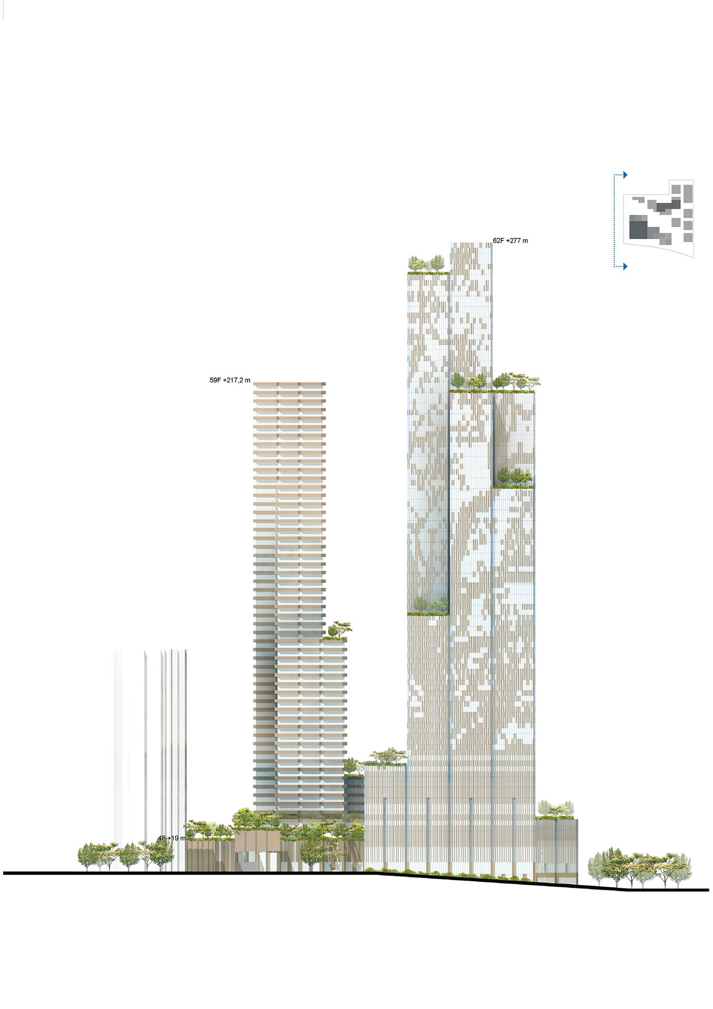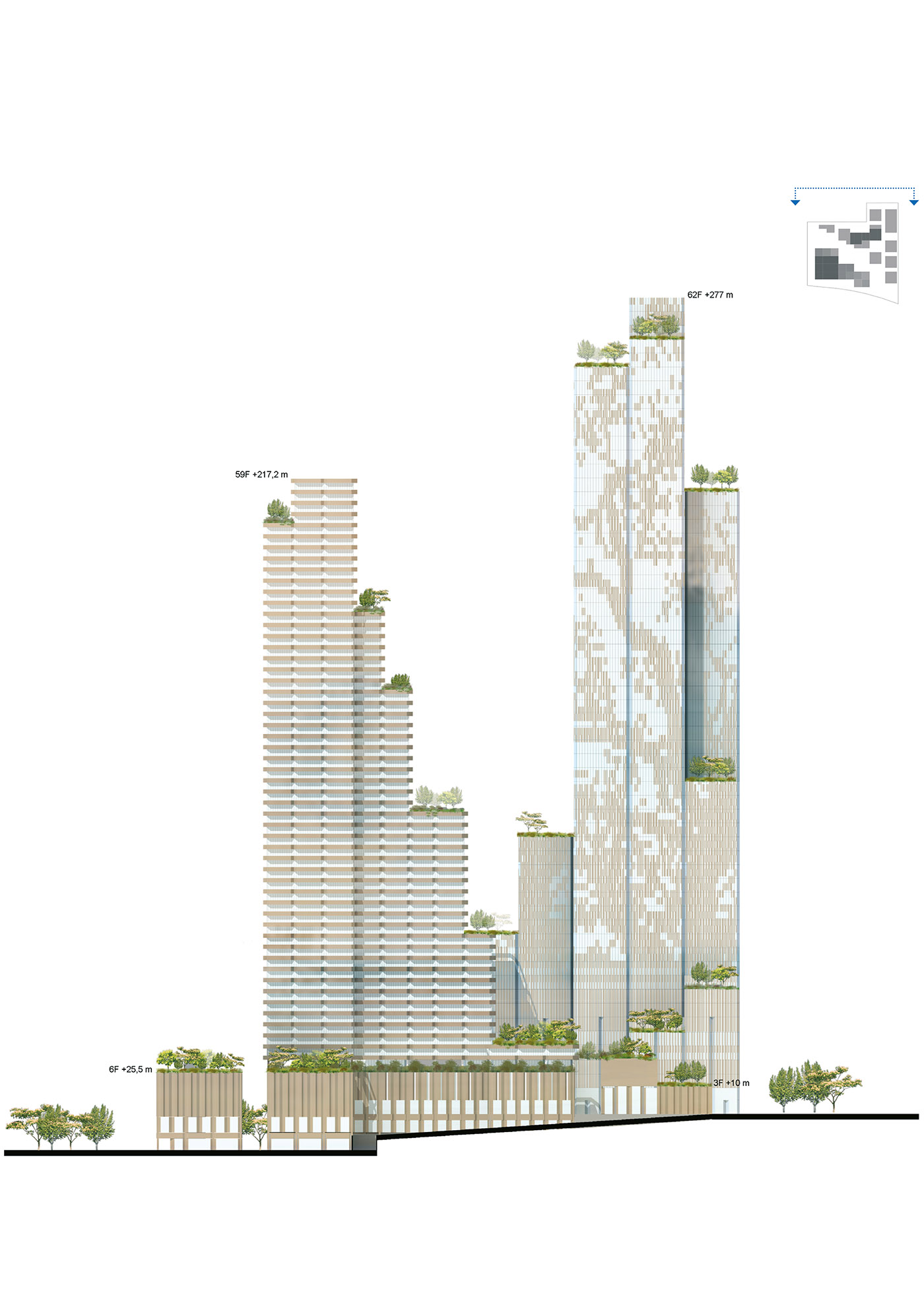 Torri alte fino 280 metri in vetro, addolcite da una maglia rampicante in rame, si alternano a moduli bassi che dialogano con il resto della città rendendo l’intervento urbanisticamente “poroso” e permeabile. L’impiego del verde nelle piazze interne al complesso e sulle terrazze, trasmette la piacevolezza dei luoghi costruiti che integrano l’elemento naturale, equilibrando l’impatto moderno dell’architettura e dei materiali utilizzati