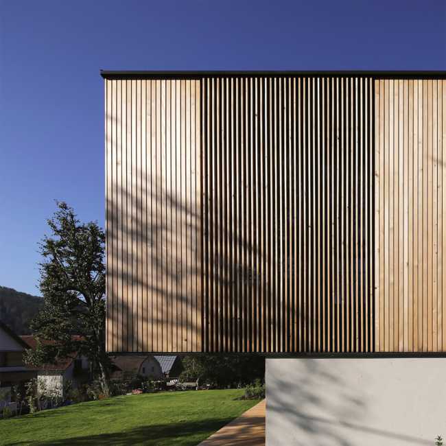 L-House a Purkersdorf. Lamelle di abete bianco ricoprono l'edificio e incorniciano il paesaggio
