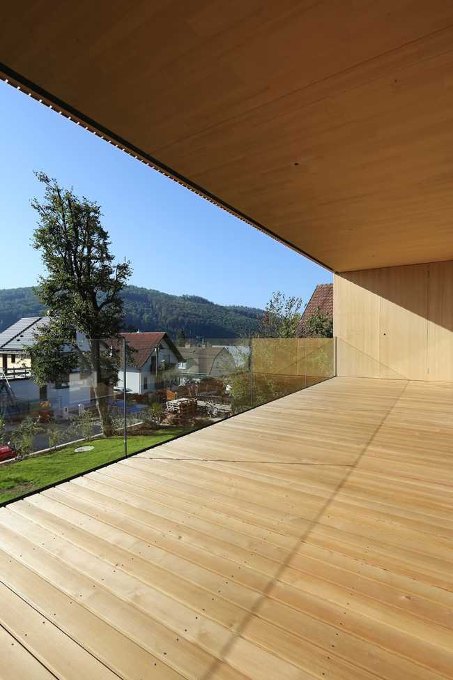 La proprietà è situata sul pendio sud sopra il villaggio di Purkersdorf e offre una splendida vista sul bosco di Vienna. Il piano superiore è stato costruito in legno e completamente coperto con abete bianco. La trama di lamelle che ricopre la facciata si allarga in corrispondenza delle superfici vetrate creando bellissimi giochi di luce nelle ore serali. Un grande balcone con parapetto vetrato si apre sul giardino incorniciando il paesaggio come se fosse un quadro