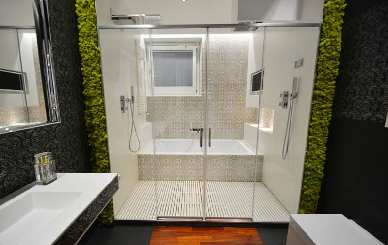 L’ambiente bagno, realizzato con materiali di pregio, è dotato di tutti i comfort ed è stato concepito come luogo naturale dedicato al proprio benessere; la differente scelta del rivestimento, scuro con venature in platino nell’antibagno e chiaro con venature in oro nella zona dotata di cromoterapia, doccia a cascata e vasca con tv, divide visivamente le funzioni, passaggio sottolineato dalla presenza del portale in muschio
