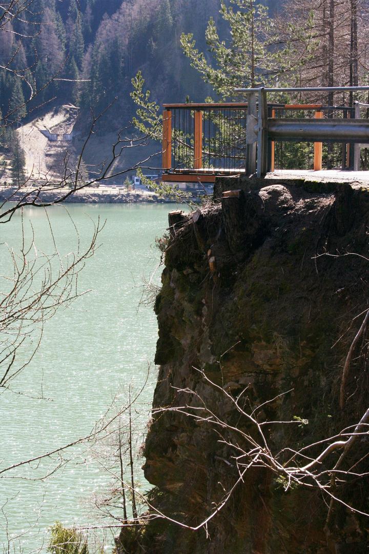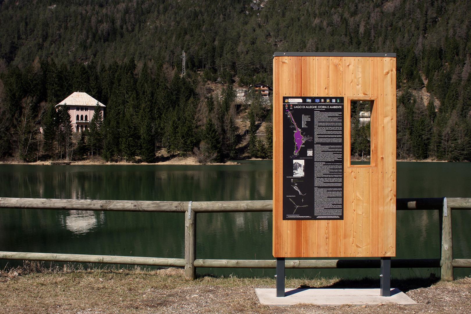 Si è voluto caratterizzare un semplice pannello esplicativo, accoppiandolo ad una “finestra”, intesa appunto come cornice che inquadra il paesaggio. Per mezzo di QR code i manufatti sono interfacciati con una piattaforma web in lingua inglese, che attende di essere implementata in futuro. È la cultura costruttiva locale che viene qui rappresentata dal progetto: il legname, il ferro; tutti elementi forti nella storia della vallata. Si è scelto inoltre di realizzare un piccolo affaccio sul punto più elevato del percorso dalla quota delle acque: uno sperone roccioso, da cui si può avere una visione panoramica del lago, dell’abitato di Alleghe e del Monte Civetta