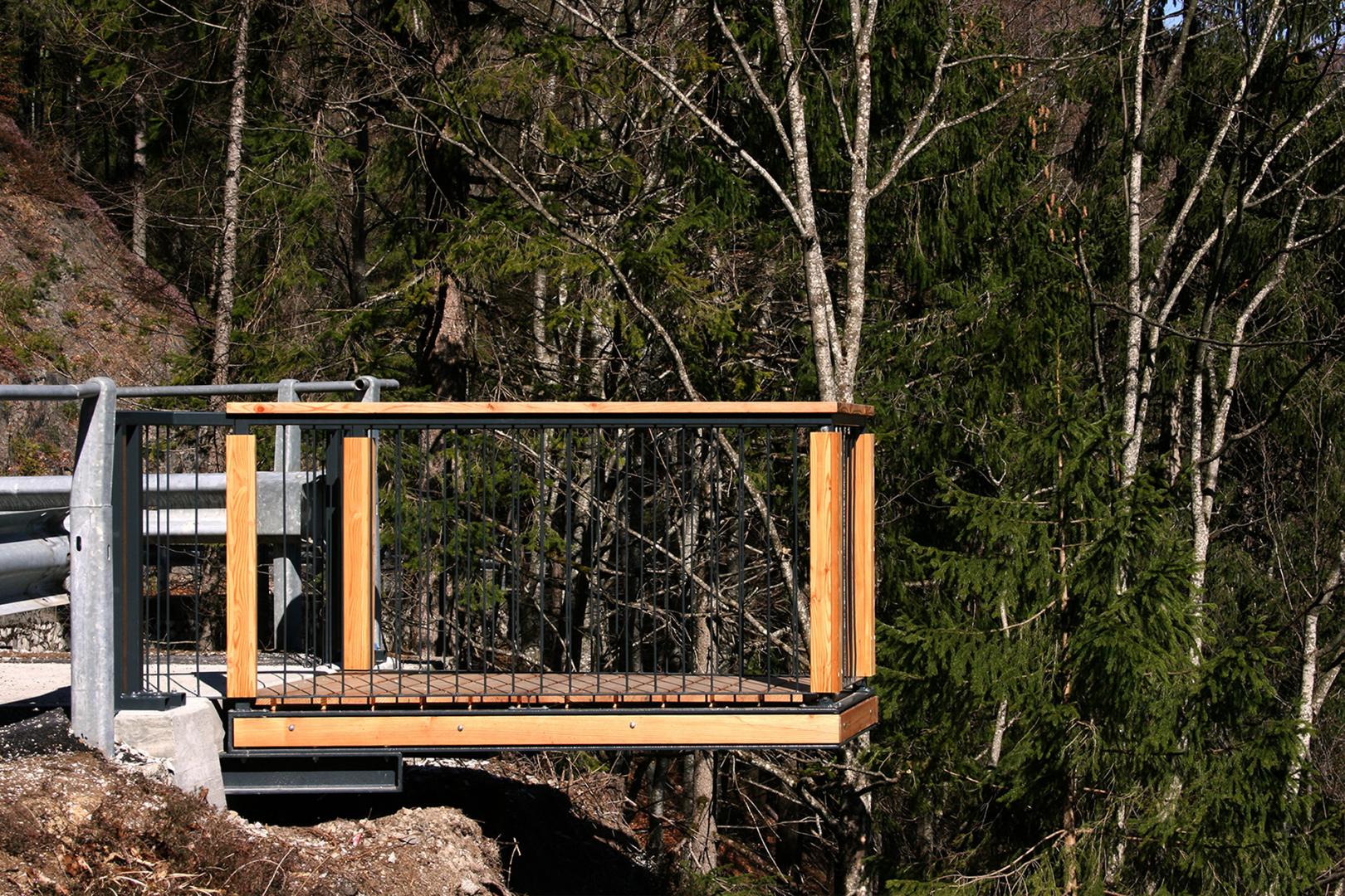 Il terrazzo avente pianta trapezoidale è realizzato a sbalzo e sorretto da una fondazione a platea gettata a filo della sede stradale. Le dimensioni non sono eccessive perché si è voluto incidere in misura minima sul paesaggio (è necessario ricordare che un punto panoramico è anche un punto visibile da un ampio panorama). A protezione degli utenti il parapetto, a montanti verticali in metallo così da renderlo meno visibile a distanza. Il rivestimento del corrimano e dei montanti principali è invece in legno di larice al naturale