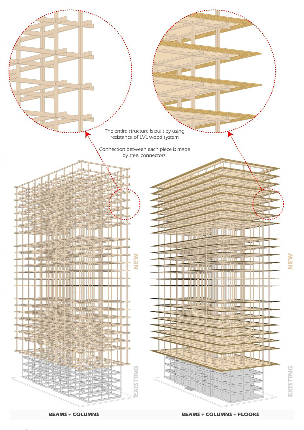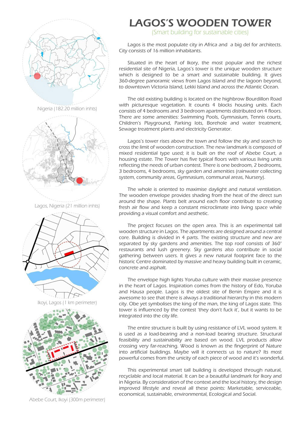 La torre è un'unità residenziale che si sviluppa attorno a temi culturali e urbani. Il progetto situato a Ikoyi, una zona residenziale di lusso, è costruito sopra una struttura esistente. La sfida era "come il tetto di oggi può essere la trama di domani? Come costruire una nuova città sopra quella esistente? Qual è il piano B per il futuro? ”. Il progetto si è concentrato sulla reinvenzione di un nuovo tessuto urbano con l'ipotesi di una soluzione e di una costruzione sostenibile con il legno. Inoltre, la città ha risorse forestali che possono produrre legname