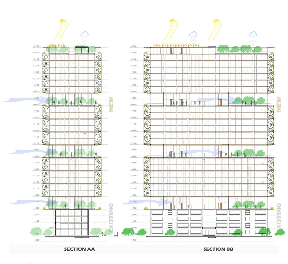 Il verde nello spazio crea bellezza, sensibilità, naturalezza, estetica e comfort per i residenti. Con il suo effetto microclima, è un polmone gigantesco nello spazio urbano che aiuta a ridurre l'inquinamento circostante. Le terrazze ti permettono di goderti il cielo e la città, il bellissimo paesaggio. Il tetto è uno spazio paesaggistico e abitativo; ha un ristorante e un giardino