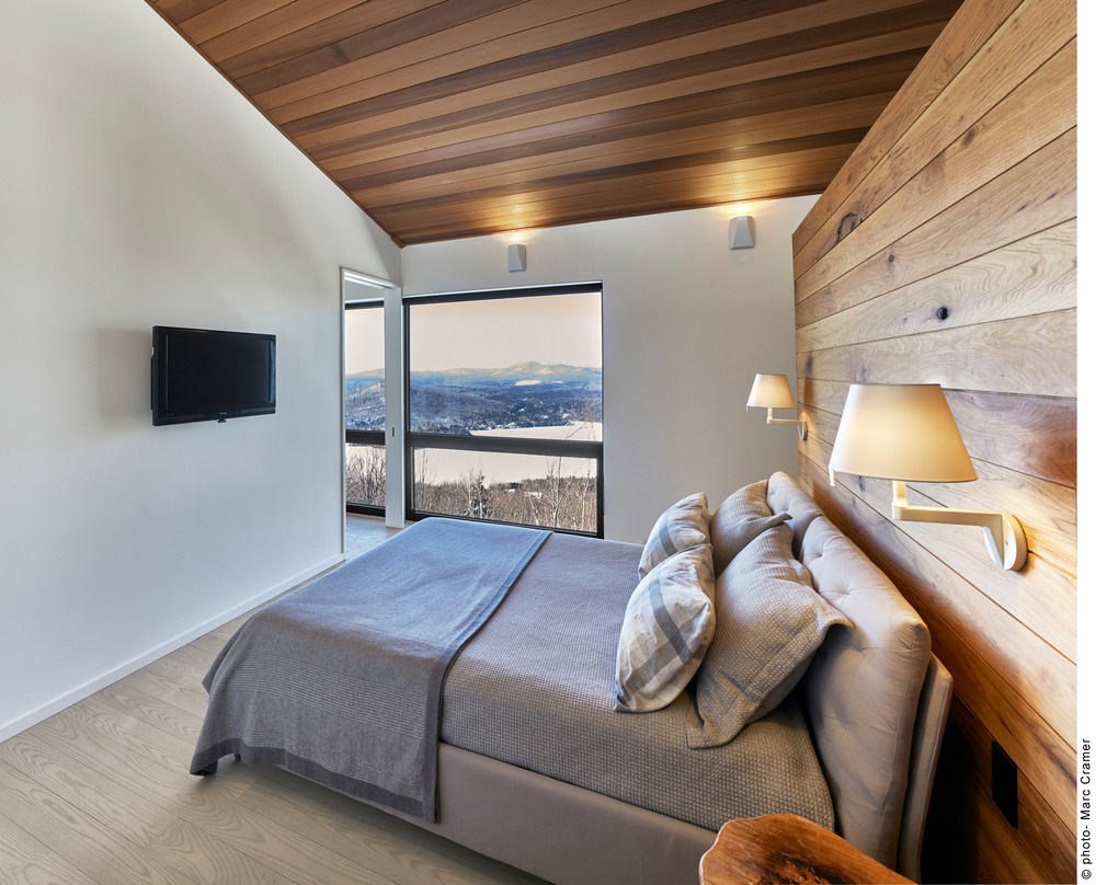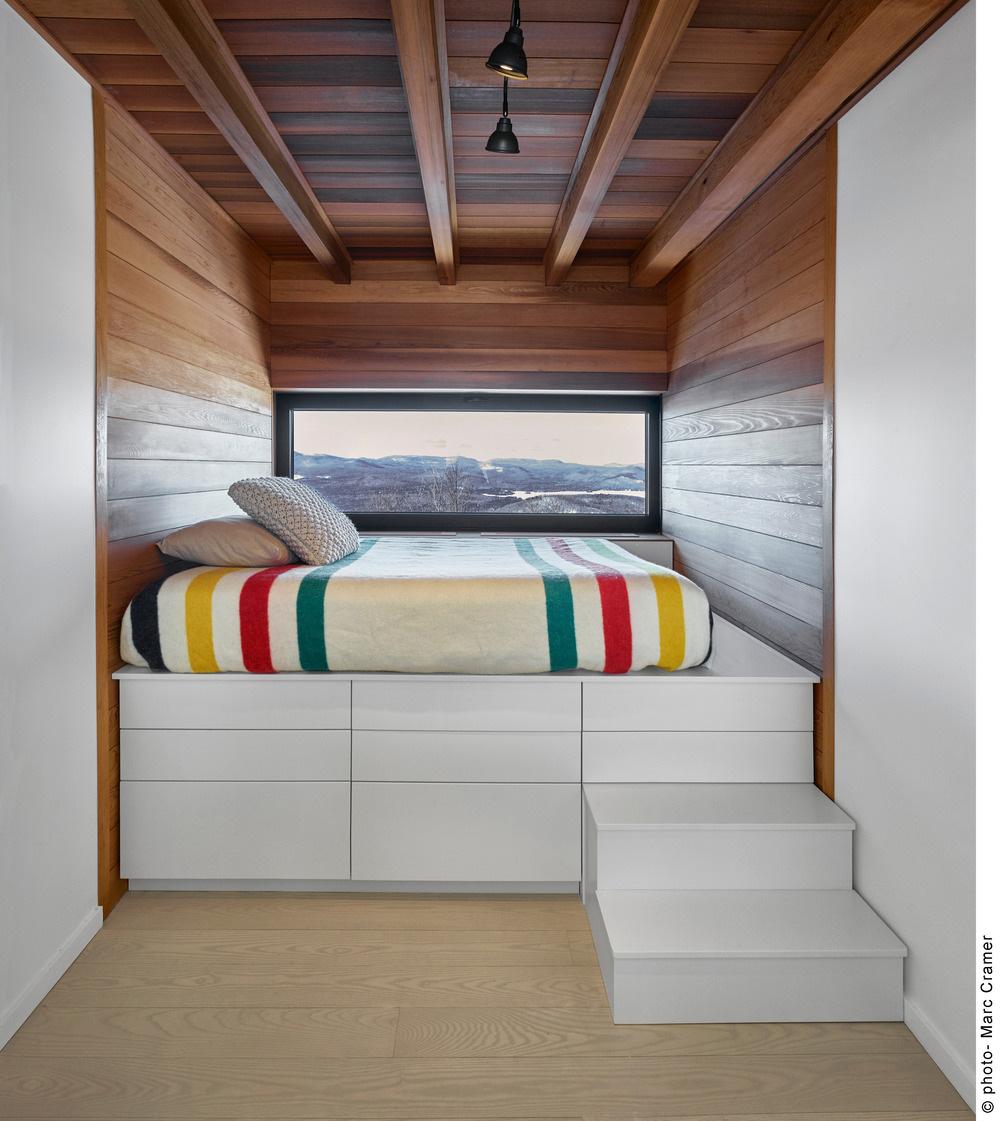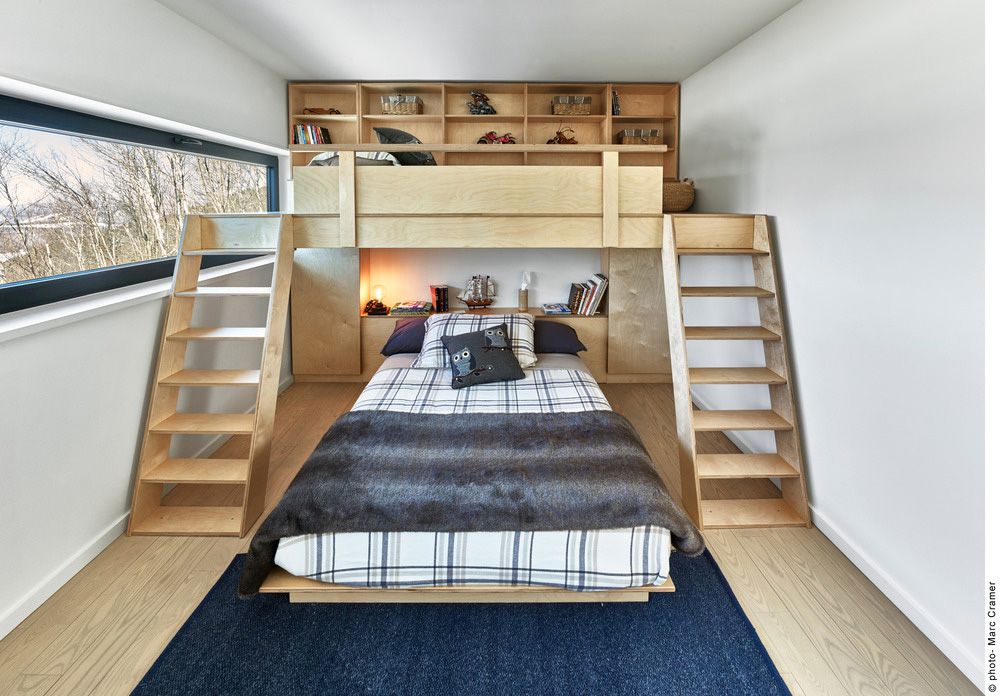 La camera da letto principale e il bagno beneficiano anche loro di grandi finestre che mantengono la connessione visiva della casa con il paesaggio circostante. Al piano inferiore, le camere da letto per bambini, una camera per gli ospiti, un bagno di vapore e una sala giochi godono di una vista spettacolare. Una delle camere da letto per bambini è dotata di un letto a castello personalizzato, mentre l'altra ha un comodo letto integrato, sopra i cassetti, disposti a filo con la finestra a tutto tondo