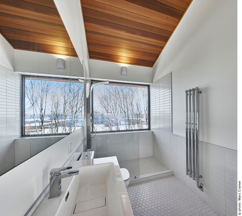 L'angolo del tetto metallico corrisponde al pendio della montagna. Le gronde esposte del tetto così come il materiale finito del soffitto in tutto l'interno del livello di vita principale è quadrato scanalato cedro rosso occidentale. L'involucro termico dello chalet è altamente isolato ed è stato accuratamente studiato per minimizzare il ponte termico e il consumo di energia