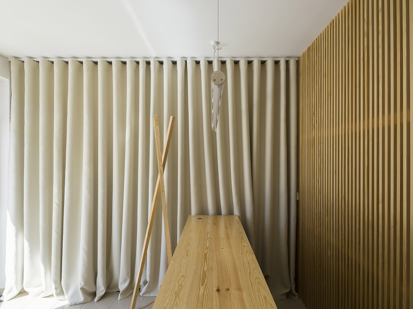 La planimetria dello spazio appare piuttosto semplice. Grazie alle doghe in legno, la luce naturale può permeare ovunque. Lo spazio appare subito molto più leggero e luminoso, e grazie all'uso del materiale legno si crea immediatamente una sensazione di maggiore benessere