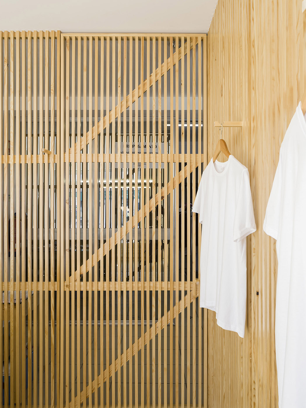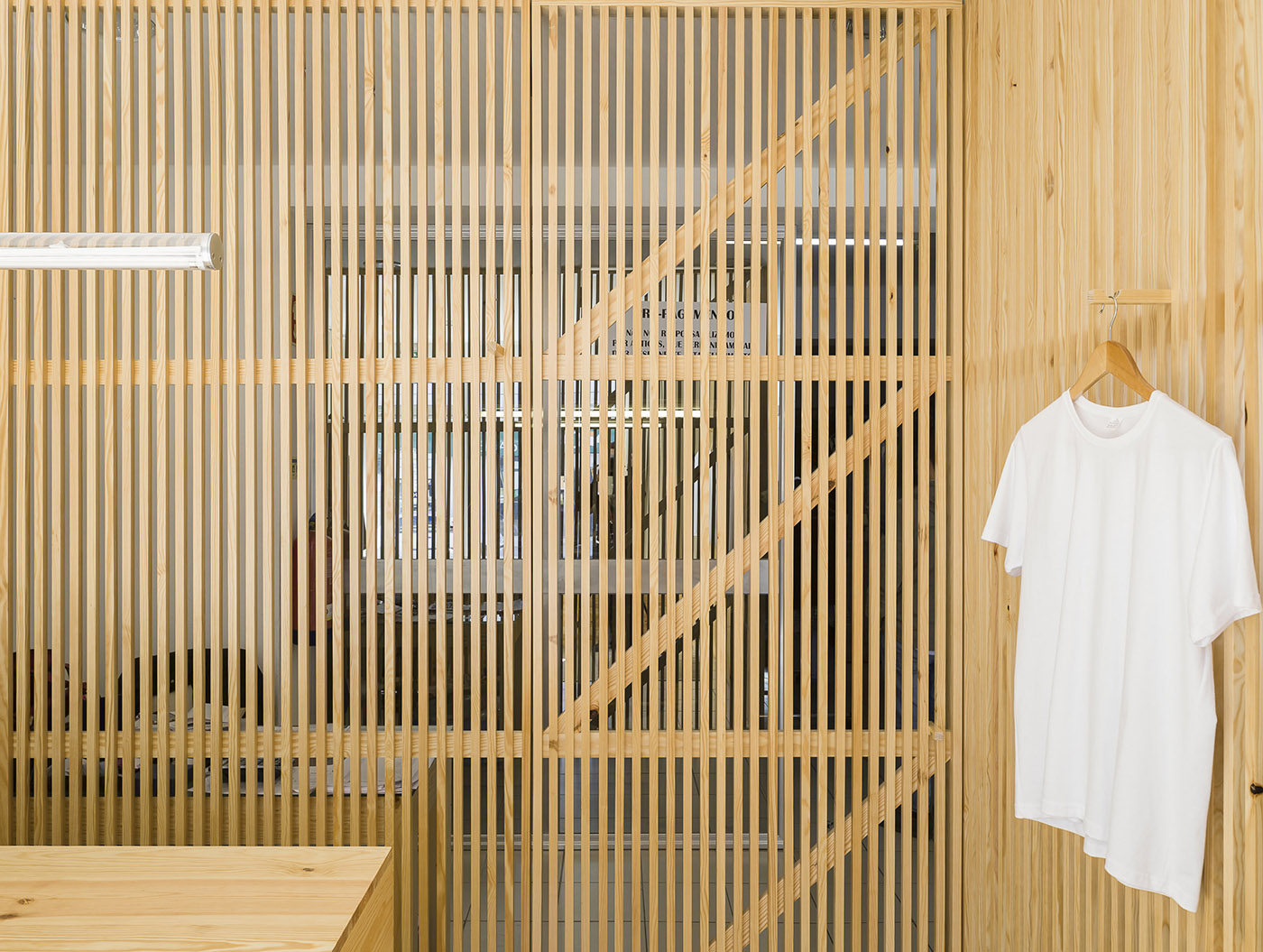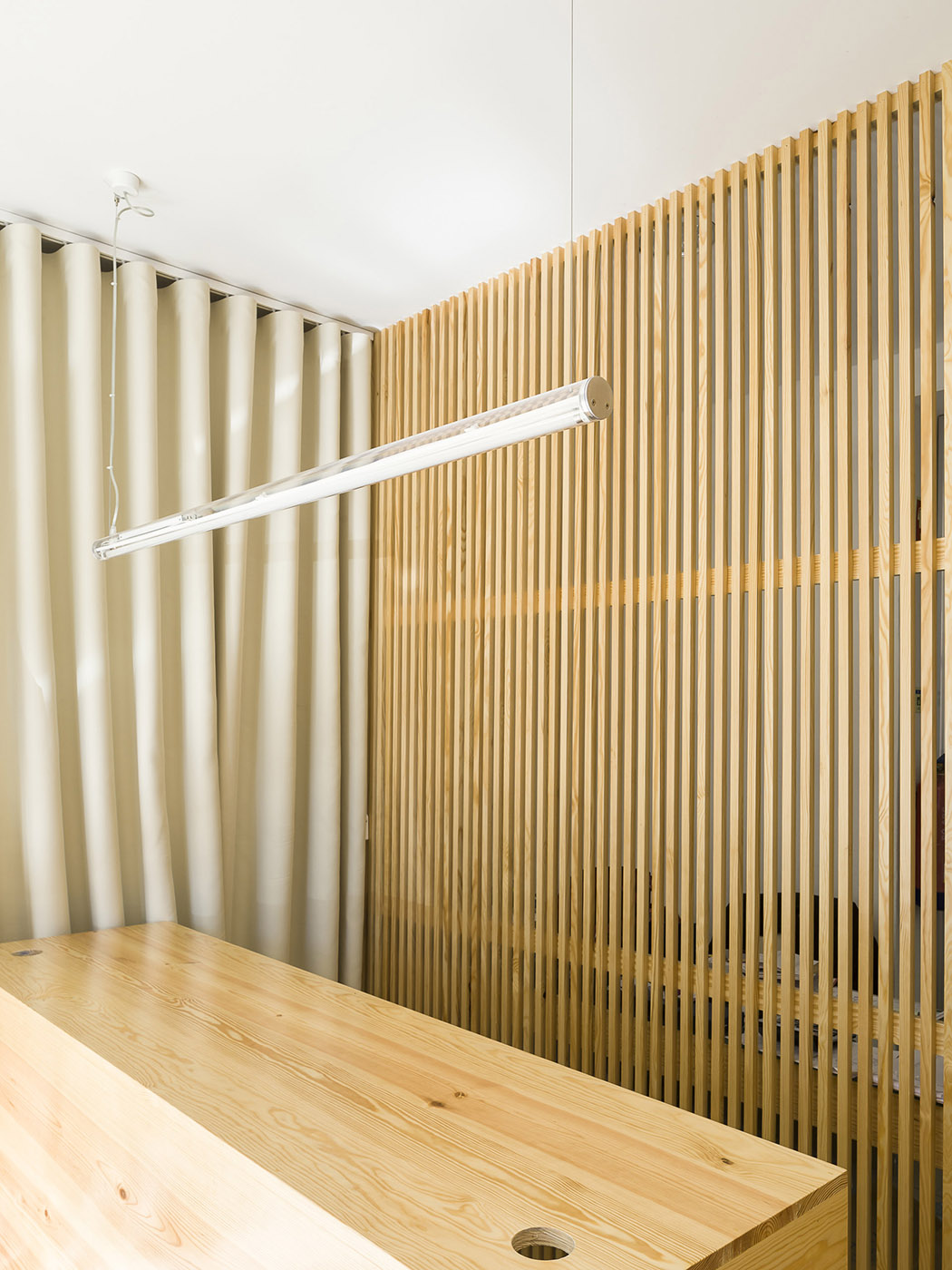 Ad Ansião, un paesino portoghese, Bruno Dias Arquitectura progetta gli interni di una lavanderia, in cui le diverse aree vengono separate tra loro tramite una struttura di doghe in legno che divide gli spazi e allo stesso tempo lascia entrare la luce naturale
