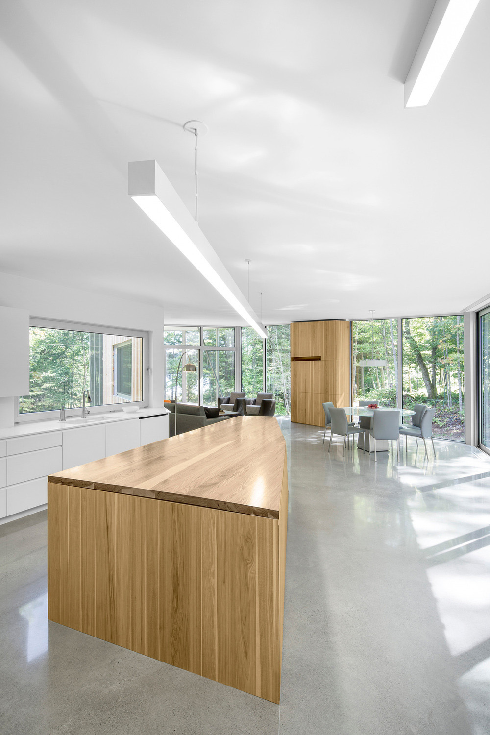 All'interno, i visitatori sono accolti da un grande pensile hickory, sagomato per offrire posti a sedere e un posto per appendere i cappotti. Dirige anche uno verso lo spazio abitativo, una grande area generosamente illuminata che culmina in una sala a sbalzo, con una vista della foce del torrente e del lago. Sul lato sud, la parete esterna lascia spazio a un'ampia superficie vetrata che si apre sulla foresta. Durante l'estate, gli alberi, come il tetto verde, creano uno schermo naturale per proteggere la casa dal calore. In inverno, quando le foglie sono cadute, la luce del sole filtra attraverso la foresta e inonda lo spazio di calore e luce