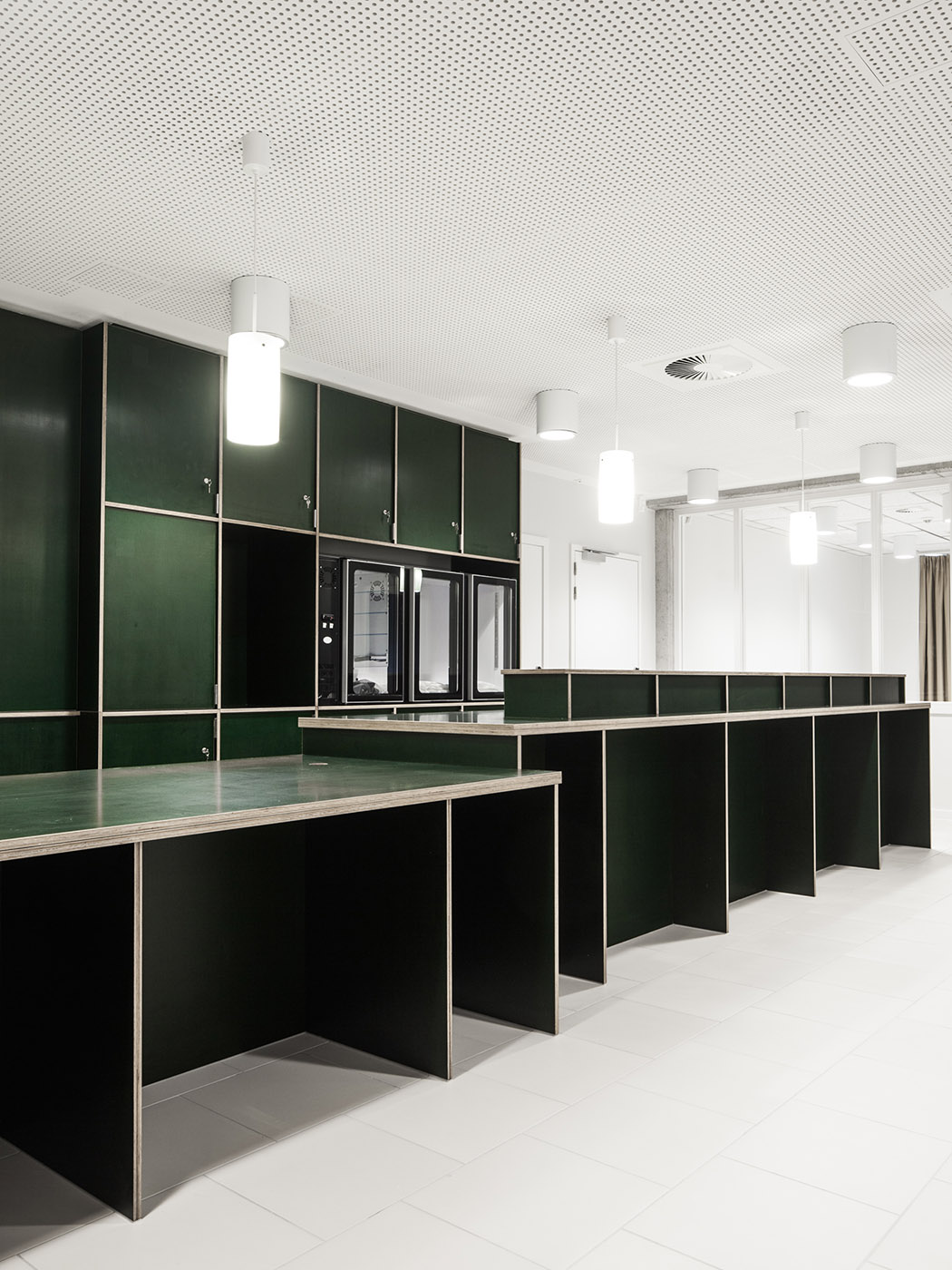 Data la natura combinata delle funzioni, la poca disponibilità di spazio e il layout urbano esistente è stato necessario svilupparsi anche in altezza per dare spazio a tutte le funzioni necessarie. Il foyer centrale adotta il ruolo della piazza pubblica, funge da filtro tra la “dimensione” pubblica della strada adiacente e lo spazio privato interno