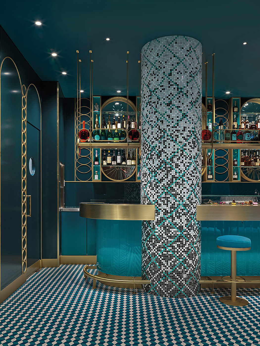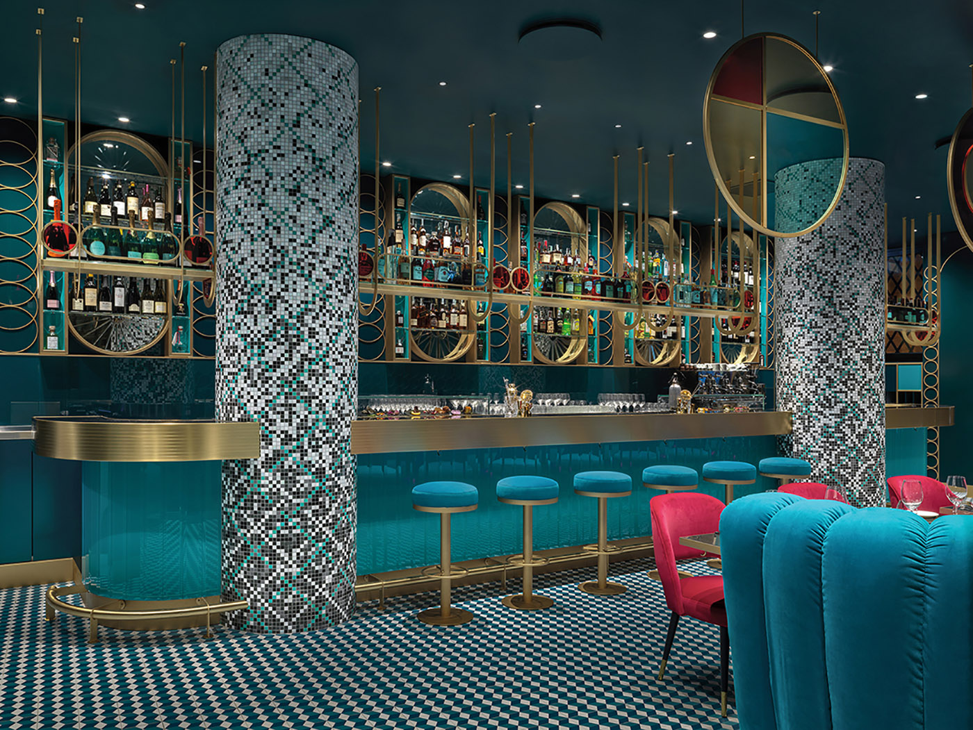 L’impiego di vetri colorati in pasta per la realizzazione di elementi decorativi architettonici è una rivisitazione contemporanea dei vetri piombati dei primi del Novecento; la scelta di geometrie essenziali e l’uso dei colori primari si ispirano, invece, alla ricerca di Wright. Le grandi colonne rivestite in mosaico trafiggono il lungo bancone dal rivestimento in vetro diamantato turchese dove su uno spesso piano in ottone fresato, gli acrobatici bar tender miscelano i loro cocktails