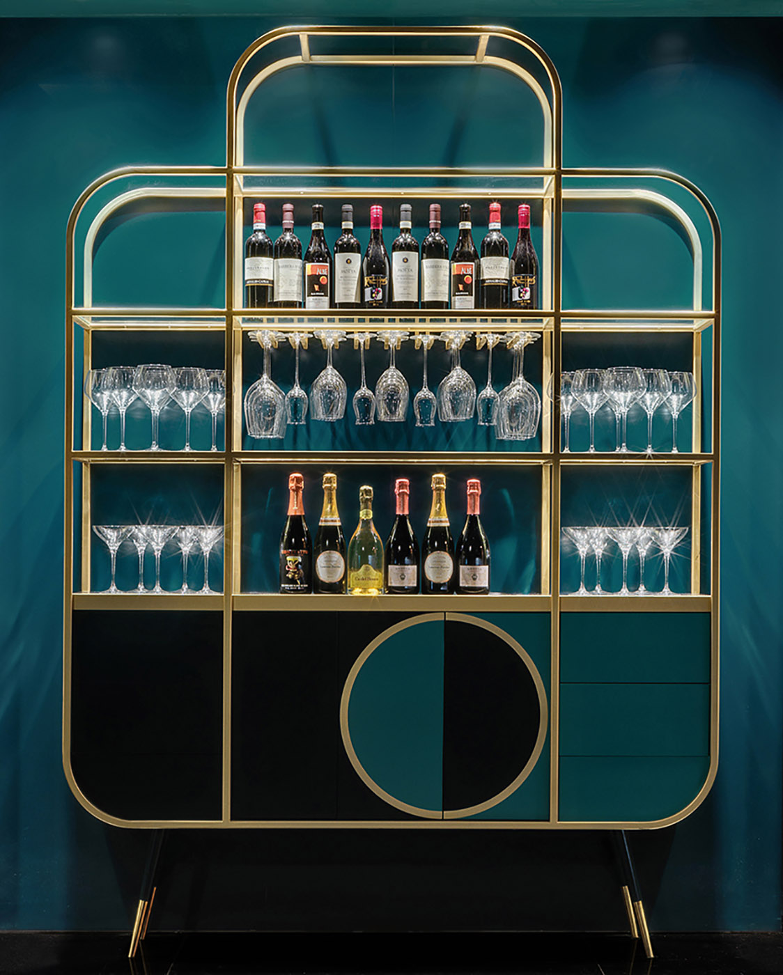 Il cerchio costituisce la matrice generatrice degli elementi dinamici, dalle linee morbide e sinuose, che caratterizzano gli interni, dai fregi sottili e arcuati che avvolgono lo spazio fino ai profondi screen a losanga tridimensionale della boiserie laccata colore ottanio. Esili strutture metalliche incorniciano elementi trasparenti colorati, come i dischi sospesi sopra i tavoli in marmo nero o gli elementi a losanga del portabottiglie sopra al bancone, dando vita a un lessico formale etereo dal sapore contemporaneo