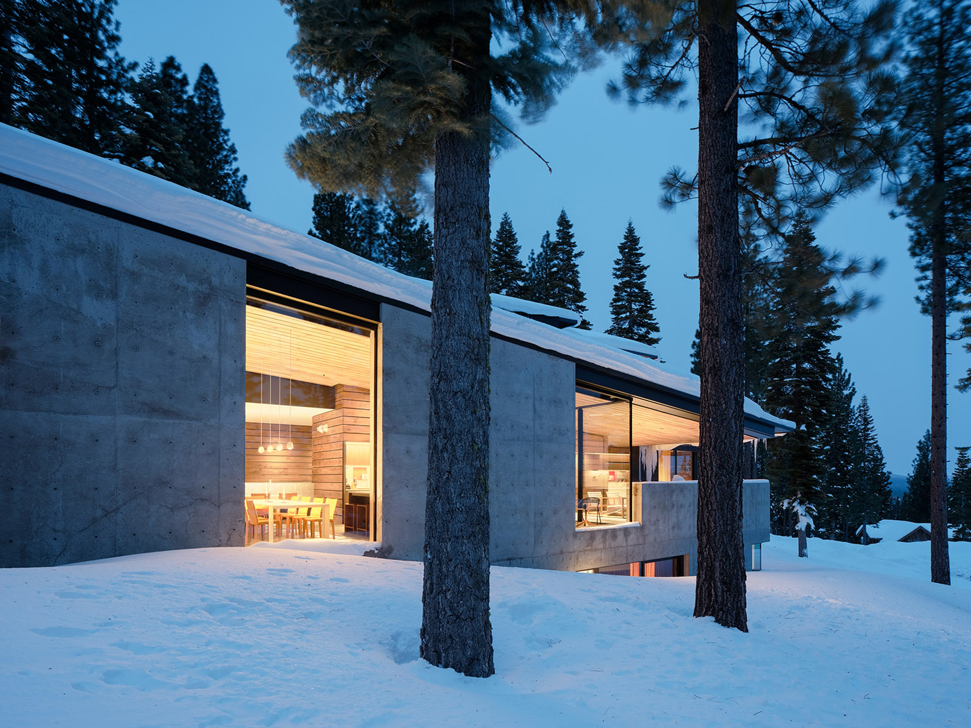 Lookout House, progettata da Faulkner Architects, si distingue per una forma che ricorda una moderna cabina sciistica, reinterpretata con un linguaggio architettonico essenziale e contemporaneo. Questo progetto rappresenta un esempio significativo di come i progetti di architettura possano integrarsi armoniosamente con il paesaggio circostante. Il livello d'ingresso, parzialmente interrato, ospita spazi funzionali come il garage, la sala giochi, la stanza per l'artigianato e il deposito per gli sci. Le camere da letto, avvolte da una calda struttura in noce della California, si affacciano su pareti di cemento che si estendono verso l'esterno, creando connessioni visive e fisiche con il paesaggio innevato, offrendo un accesso sicuro per gli amanti dello sci.
