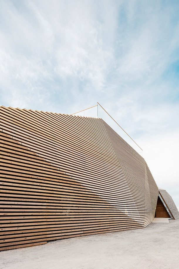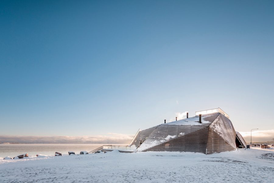 Situato a Hernesaari, Helsinki, Löyly è una straordinaria sauna pubblica, che ha rapidamente trasformato un'ex area industriale in un vivace punto di riferimento culturale e turistico. Progettato dagli architetti Ville Hara e Anu Puustinen di Avanto Architects, Löyly offre un'interpretazione moderna della tradizionale esperienza della sauna finlandese. L'edificio, con una superficie totale di 1071 metri quadrati, si distingue per la sua innovativa struttura in legno termotrattato, composta da oltre 4000 assi tagliate su misura per creare una mantella che avvolge un volume rettangolare nero.