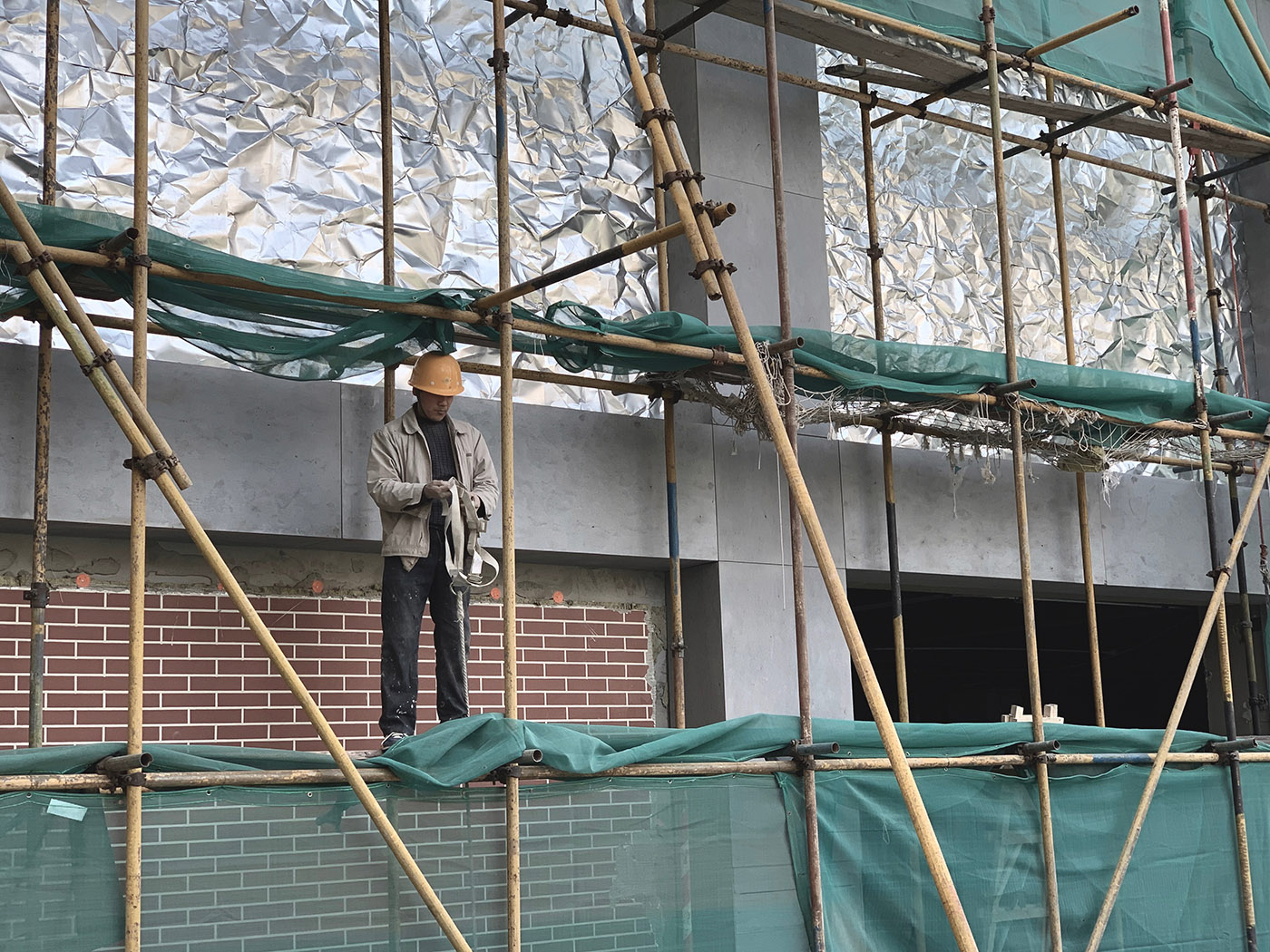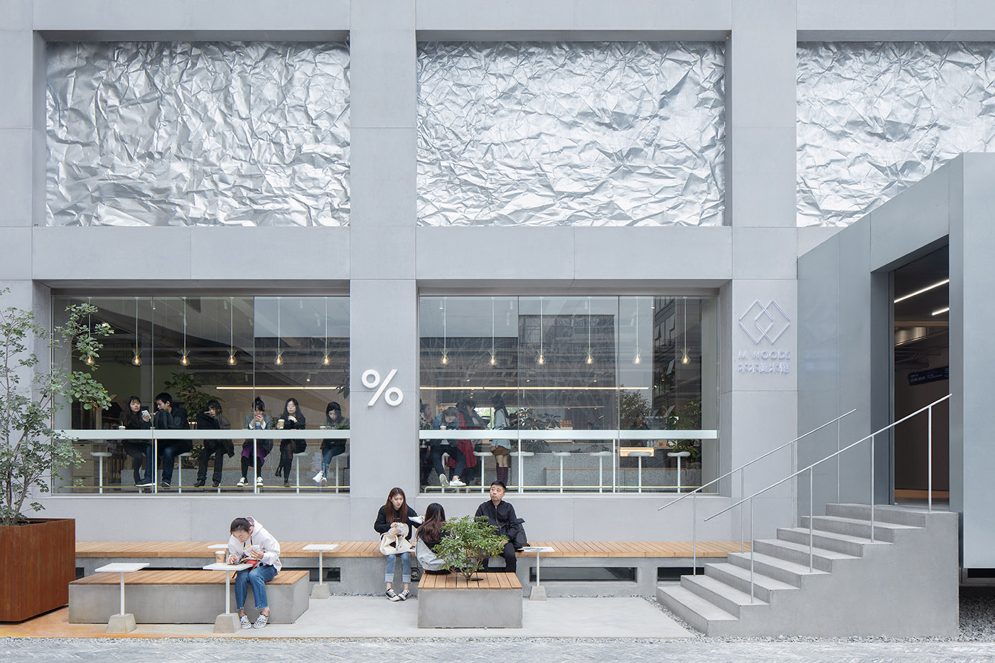 In qualità di istituzione artistica indipendente e senza scopo di lucro, M WOODS ha un rigoroso controllo dei costi per il progetto di ristrutturazione. Invece di scegliere materiali di facciata comuni, B.L.U.E. Architecture Studio scopre un nuovo materiale: la lamiera di acciaio zincata, e la usa per creare i tamponamenti della struttura ooriginale in facciata sottoforma di fogli piegati artigianalmente con un effetto davvero originale. L'acciaio zincato ha un'ottima resistenza alla corrosione e una struttura superficiale unica oltre che un costo contenuto, è infatti utilizzata solitamente per impianti e condotti di ventilazione