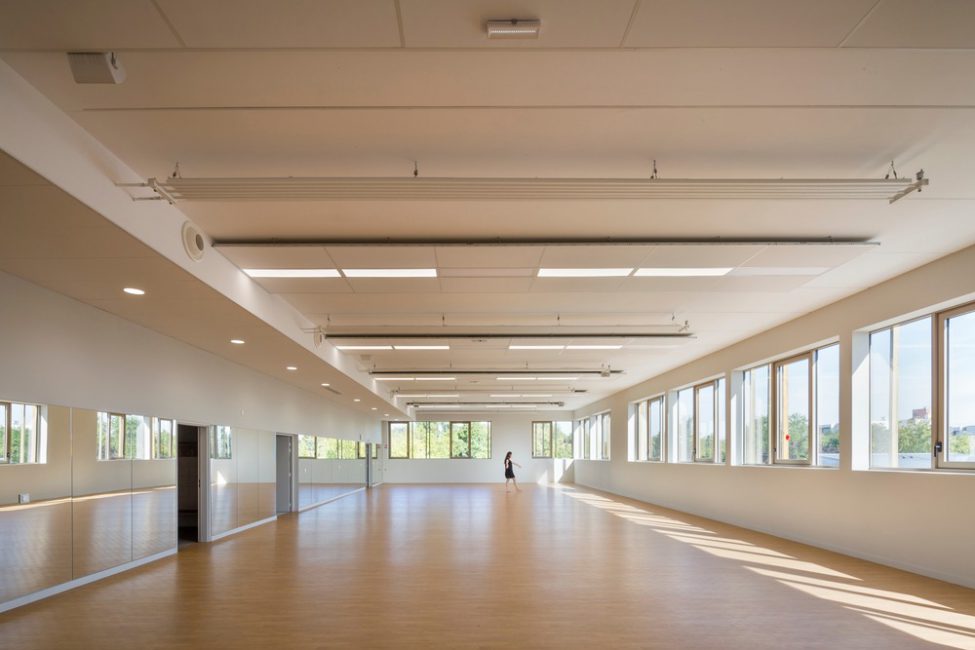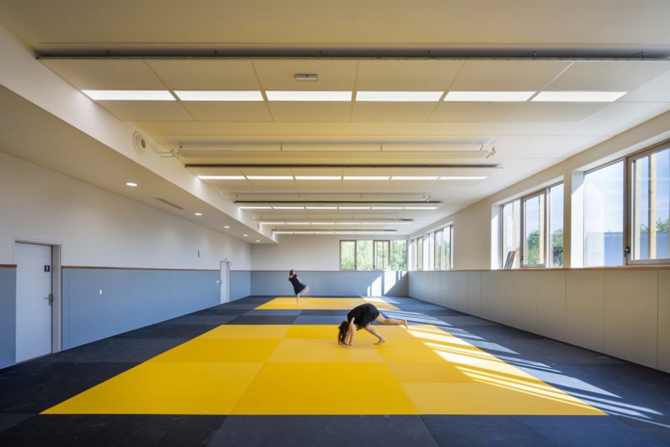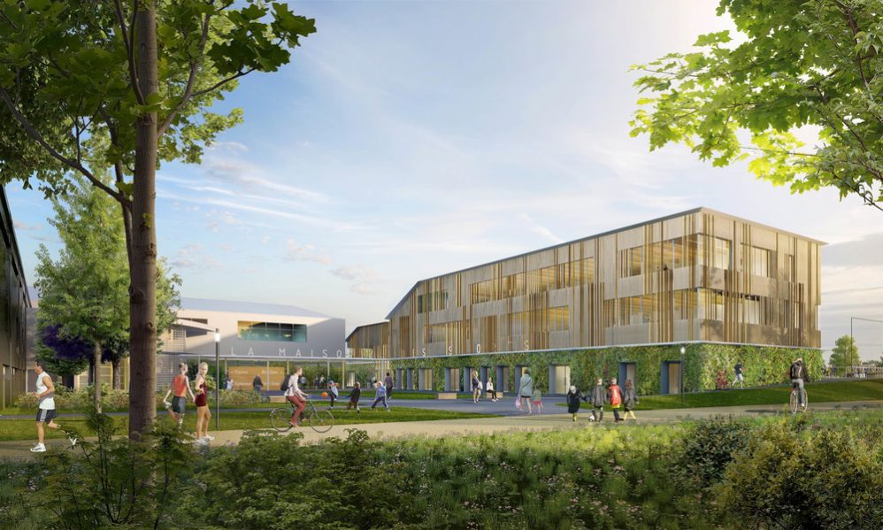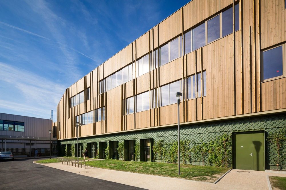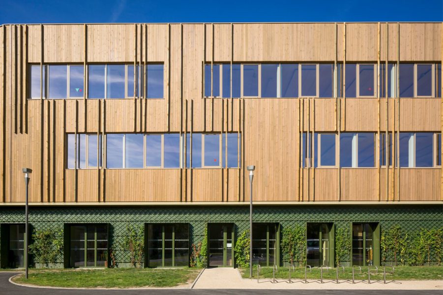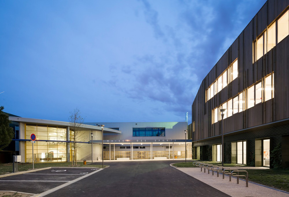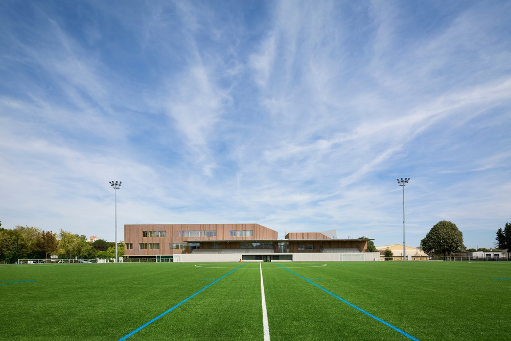Lo studio di architettura agence ENGASSER & associés realizza un centro sportivo a Bezons, in Francia, un progetto di ristrutturazione globale su scala urbana che ha previsto un edificio di legno a due piani che accoglie le palestre