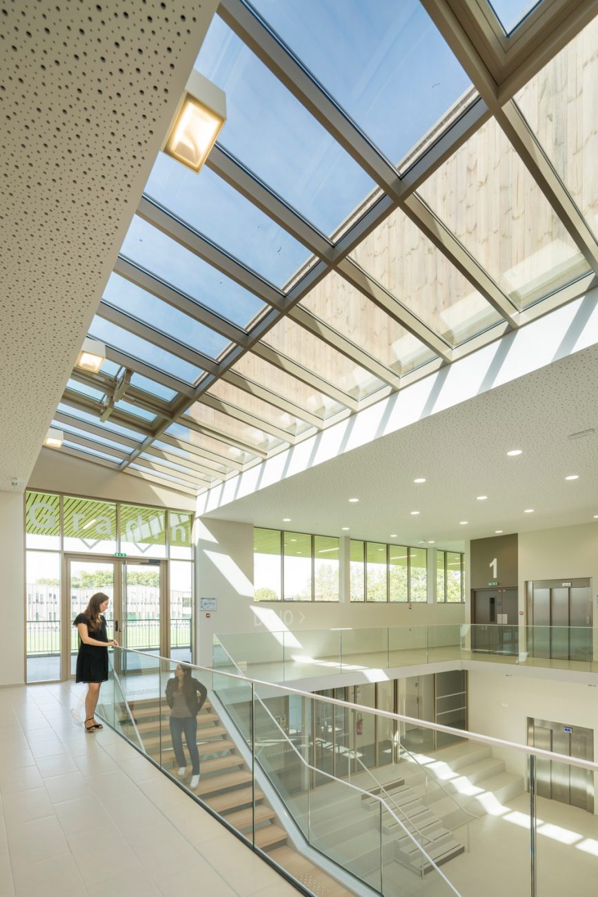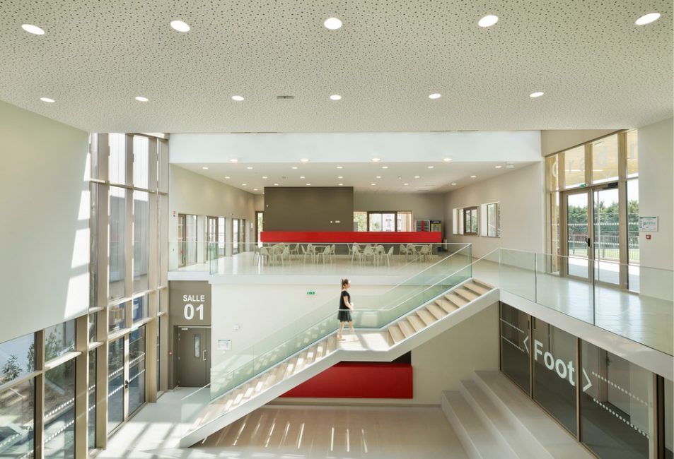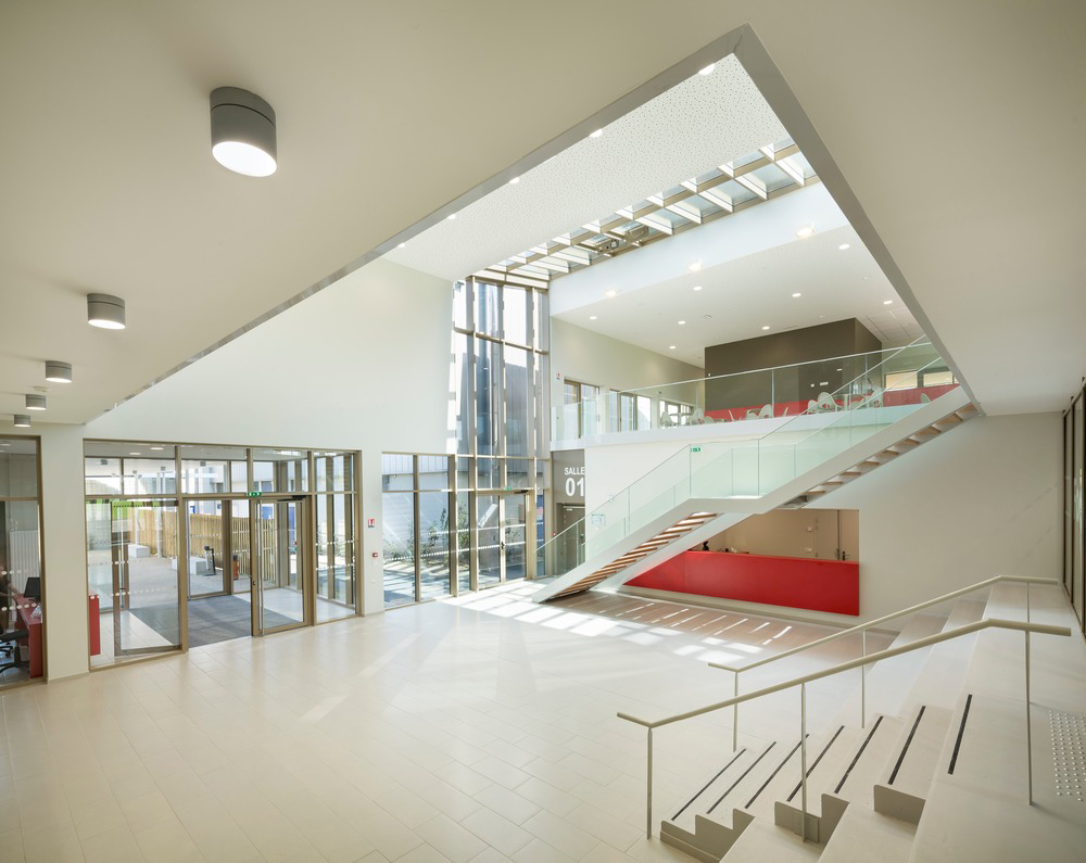 Con la facciata e il tetto generosamente vetrati, l'atrio centrale lascia entrare la luce naturale al centro del centro sportivo. Essendo una passeggiata, offre una vista ininterrotta del campo da calcio, e la sua doppia altezza (circa 8 m) crea un rapporto immediato con il bar al primo piano. Il rifugio del custode, situato molto vicino all'ingresso, e un ampio banco della reception nella hall consentono di monitorare i punti di accesso e guidare i visitatori