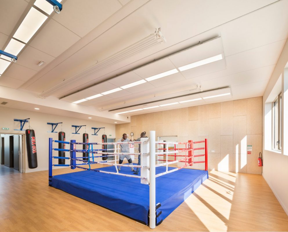 Il Centro Sportivo riunisce un gran numero di elementi provenienti da diversi brief, vale a dire una palestra già esistente, una piscina e campi da tennis al coperto con la creazione di un'arena polifunzionale, una sala di pugilato, una sala di bodybuilding, due dojo, un campo da calcio con tribune, campi da tennis all'aperto e una club house