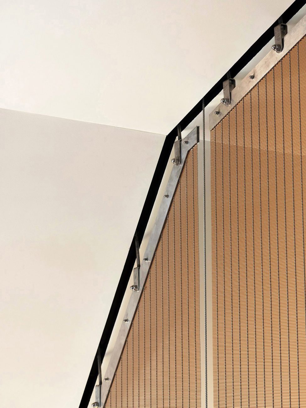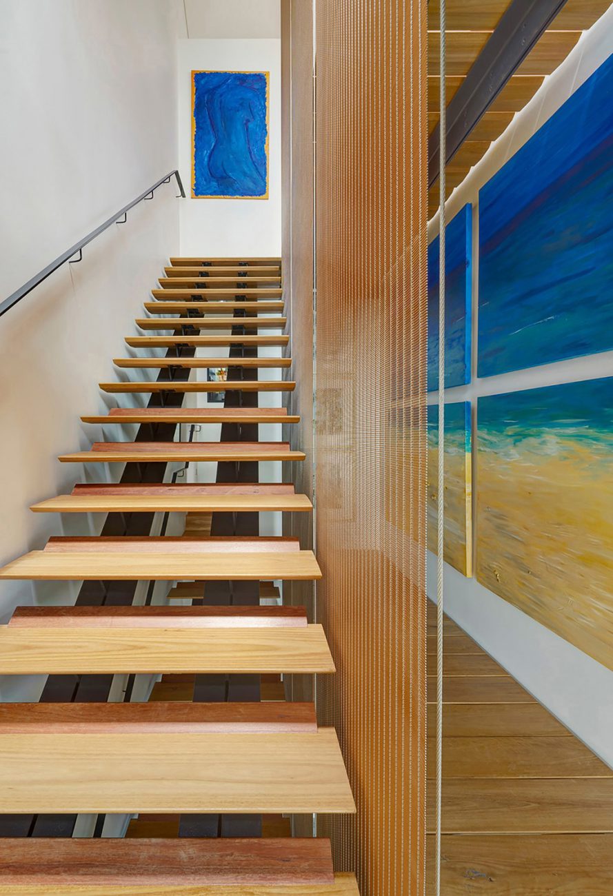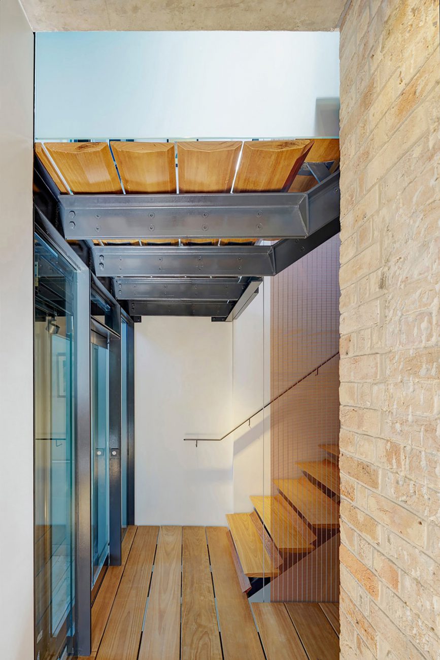 Scendendo lungo la lunghezza della scala c'è uno schermo d'acciaio teso come balaustra, fabbricato e importato dalla Germania. Montare un elemento architettonico contemporaneo così esigente in un vecchio edificio non è stato facile. C'è un sacco di scienza e tecnologia per far funzionare tutto e in modo che possa essere regolato nel corso degli anni