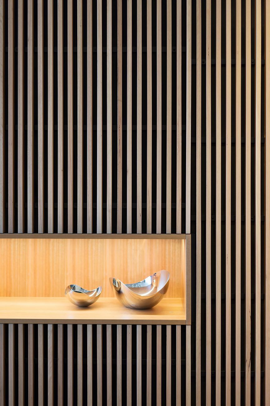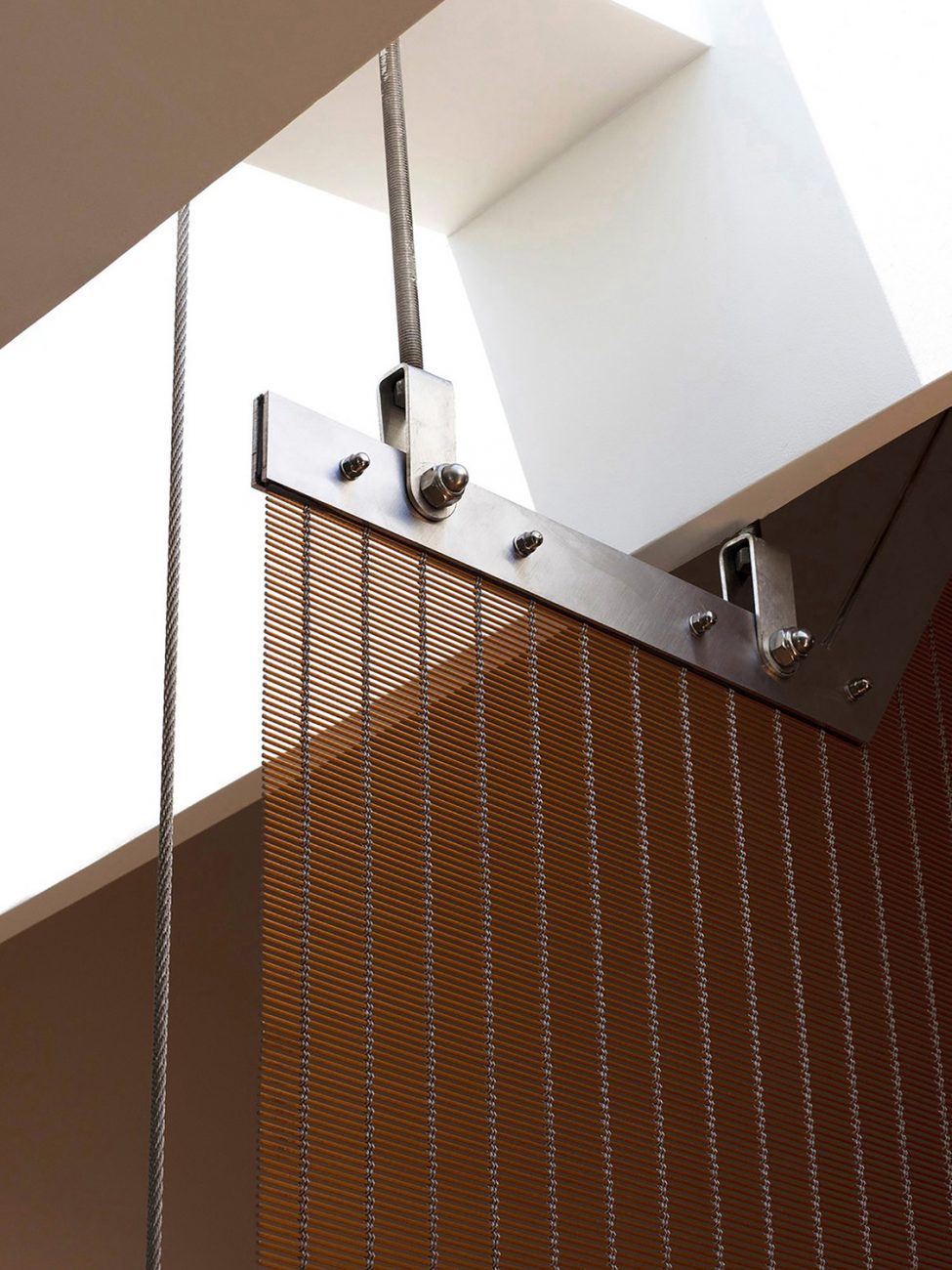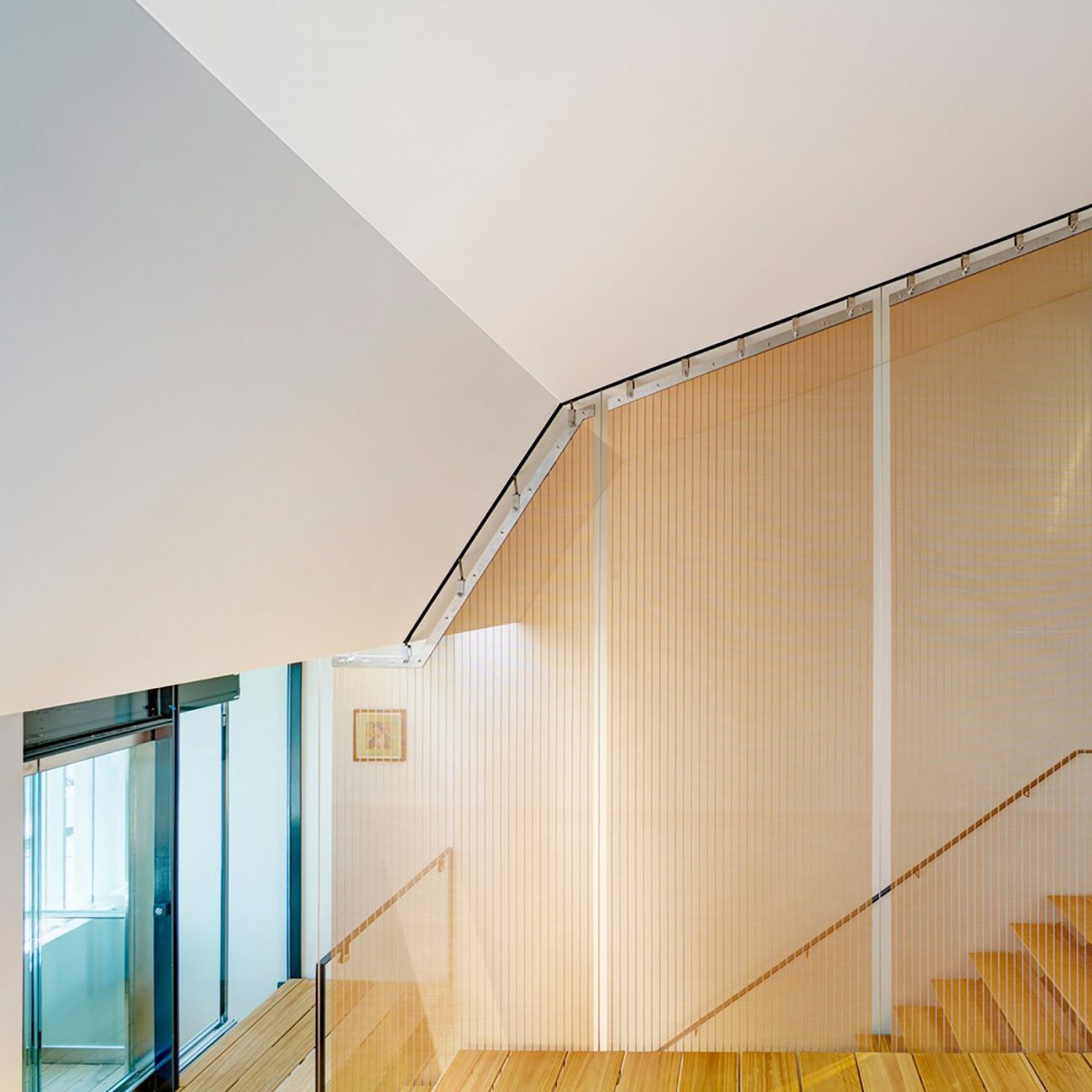 Scendendo lungo la lunghezza della scala c'è uno schermo d'acciaio teso come balaustra, fabbricato e importato dalla Germania. Montare un elemento architettonico contemporaneo così esigente in un vecchio edificio non è stato facile. C'è un sacco di scienza e tecnologia per far funzionare tutto e in modo che possa essere regolato nel corso degli anni