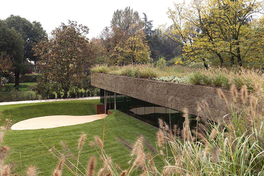 Lo studio internazionale CRA-Carlo Ratti Associati, conosciuto nel mondo per il suoi progetti di architettura che innovano il settore guidati dall’intento di “fondere il naturale con l’artificiale”, concepisce la nuova Mensa Mutti. Lo spazio, pensato per connettere persone e territorio, è costituito da una zolla di terra di 500 metri quadri sollevata da terra fino a 5 metri sotto la quale si sviluppano i 1200 metri quadri di interni, completati dalla vecchia taverna ristrutturata e adibita a cucina visibile dalla strada: Quisimangia