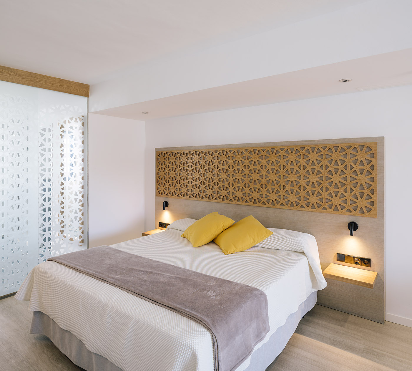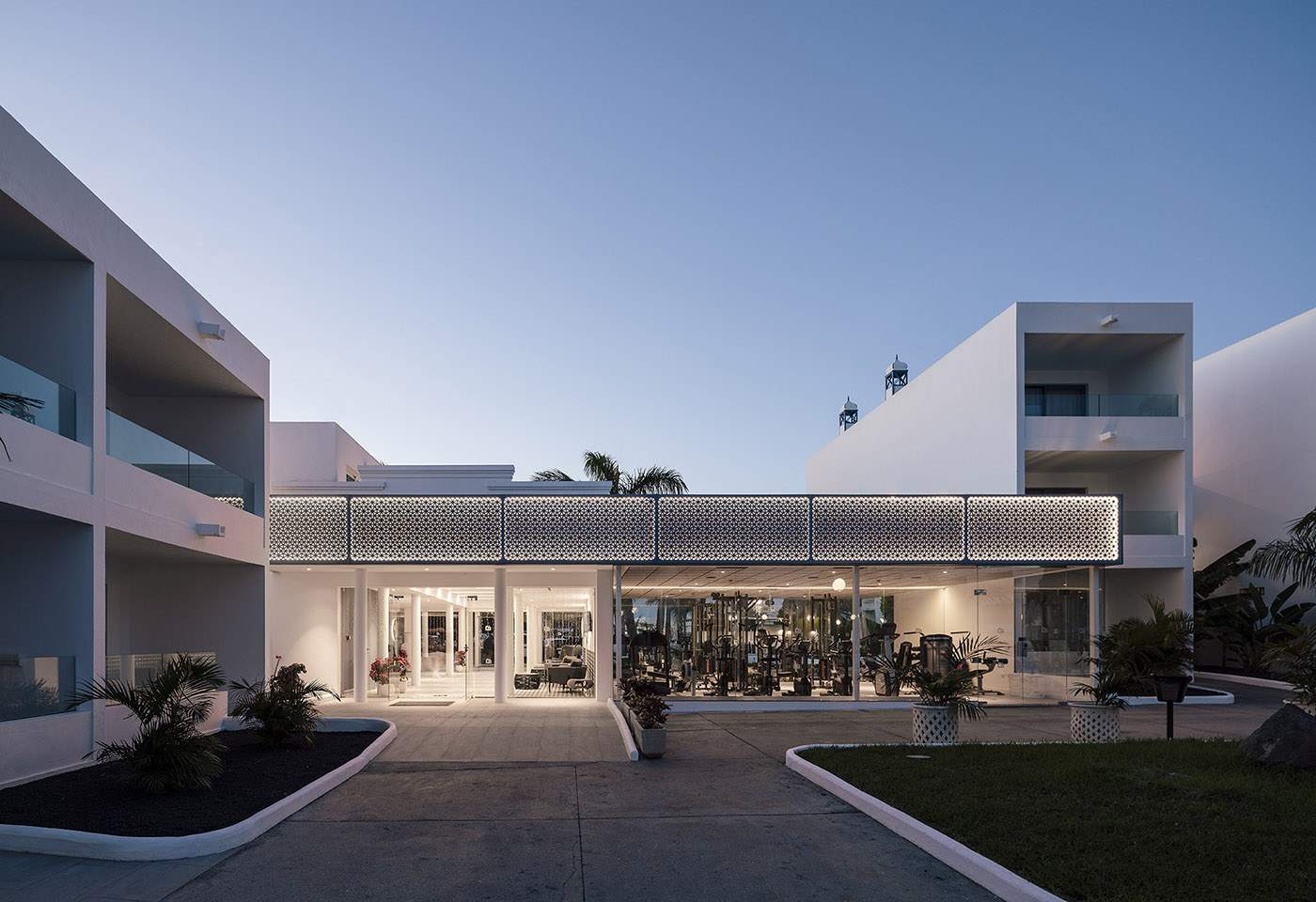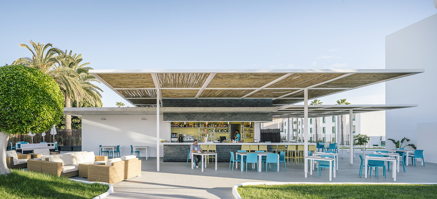 Lo studio spagnolo Zooco interviene sull’esistente utilizzando come punti chiave del restyling il bianco dei muri in contrasto con il blu per le falegnamerie, l’uso del vetro, del basalto e del bambù. Utilizza una “gelosia” come elemento decorativo ricorrente che lega il progetto, un reticolato che declina nelle varie funzioni di testata in legno per i letti, di maglia metallica blu sulle facciate esterne, e dei due grandi pergolati d’ingresso all’edificio principale