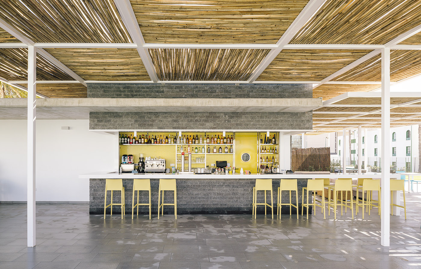 Affacciato su una delle piscine del complesso, è stato costruito un nuovo edificio in pietra basaltica, con uso bar piscina, caratterizzato da grandi pergole di bambù a diverse altezze, che generano spazi all'aperto protetti dal sole