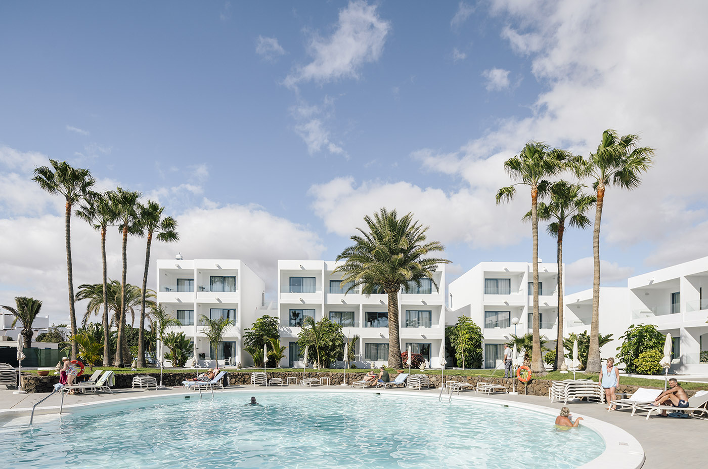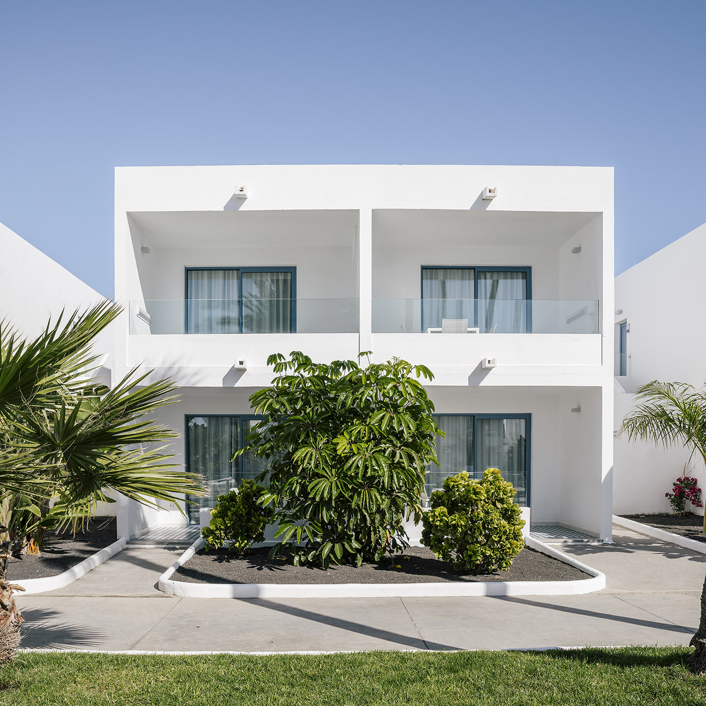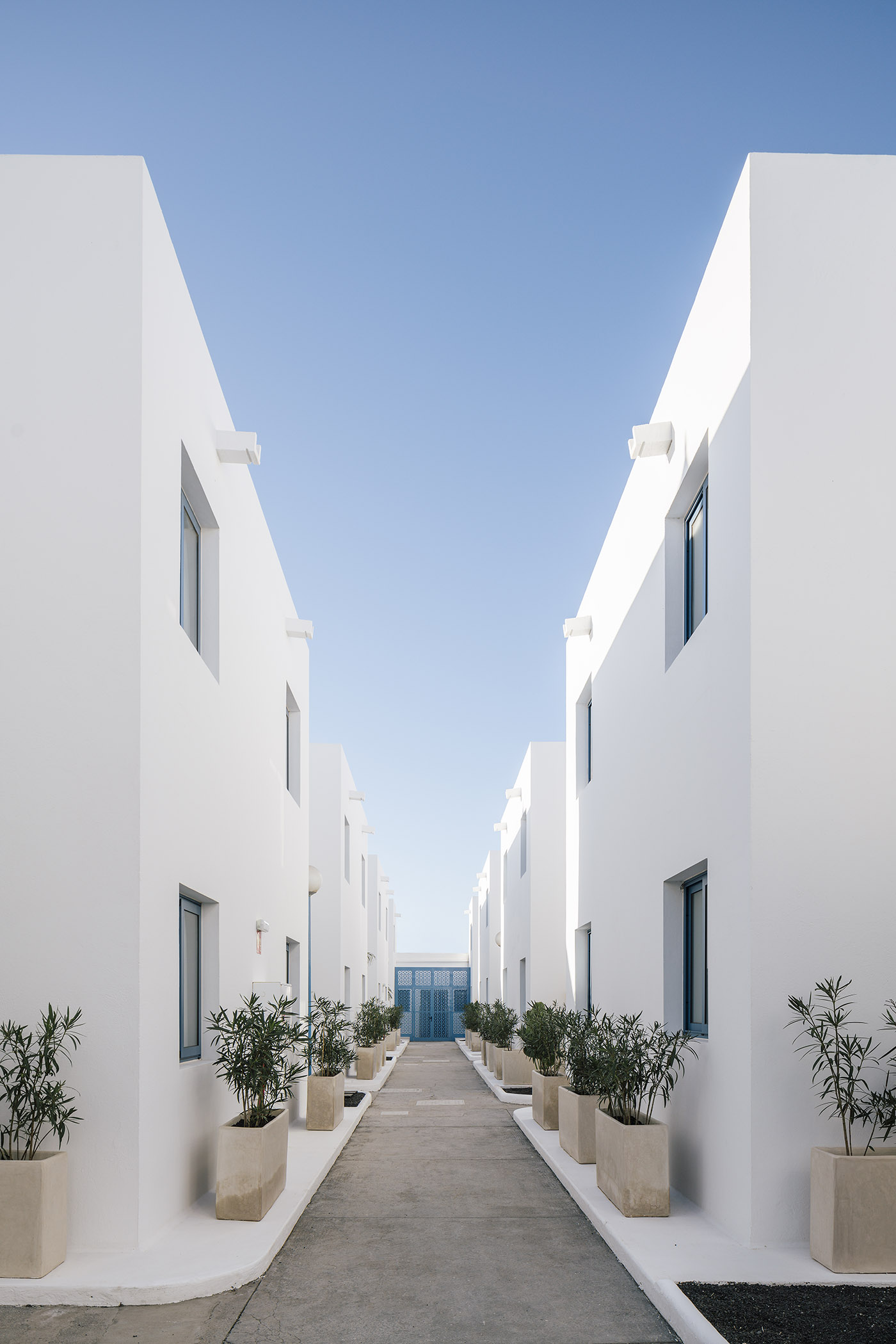 Minute abitazioni bianche con inserti in blu a dare la sensazione rilassante di piccolo borgo; volumi puliti ed essenziali per restituire purezza formale e lasciare al cielo e al sole di Lanzarote il ruolo di protagonista in questo complesso alberghiero nella zona centro-est dell’isola