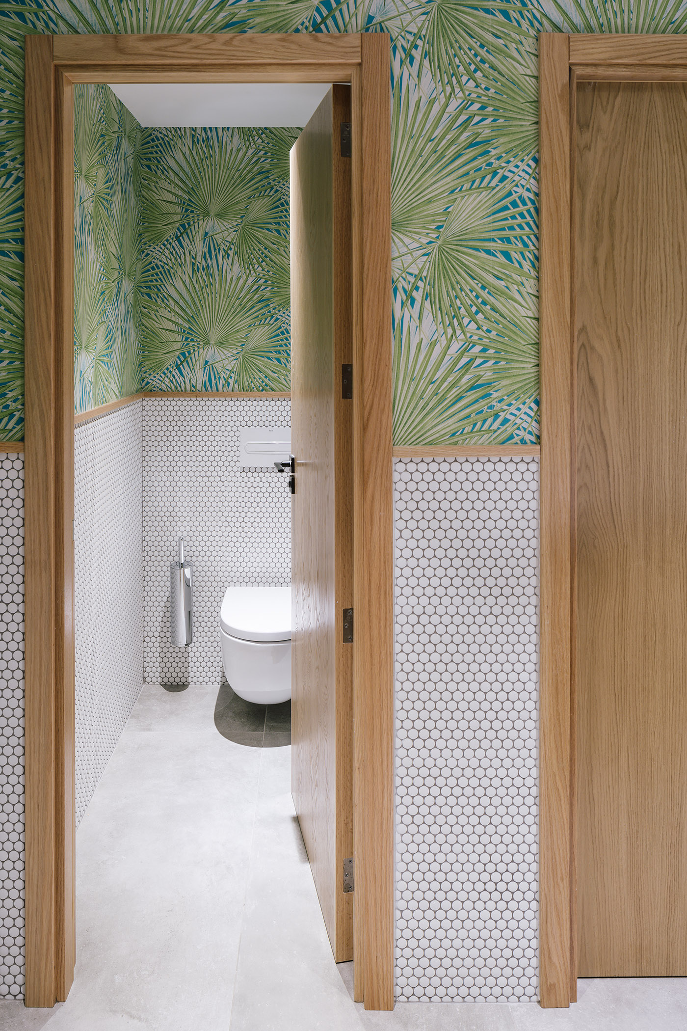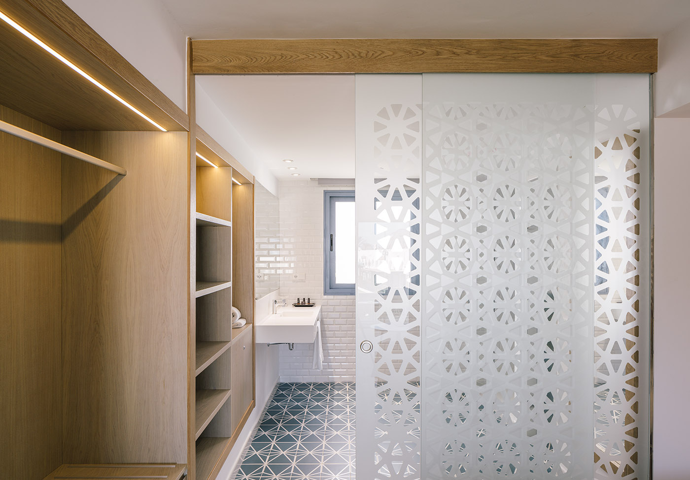 Le “casette”, di due o tre piani, ospitano unità abitativo-ricettive di varie tipologie: camere doppie con soggiorno, monolocali, e appartamenti con cucina. Il tema decorativo segue una moodboard di colori morbidi: bianco, beige, grigio, legno, potenziati con tocchi di colore blu, sia nelle falegnamerie che negli elementi ceramici del bagno e delle terrazze