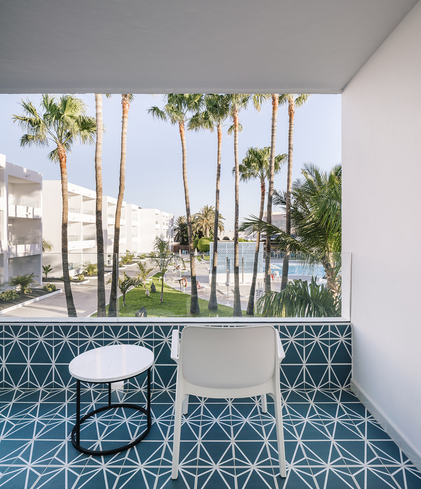 Moodboard delicata con sprazzi di blu. Un complesso alberghiero stile piccolo borgo a Lanzarote