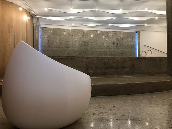 Le pareti curve, trasparenti da una parte e opache dall'altra, in particolare in legno microlamellare di faggio, albero autoctono, richiamano le forme naturali della zona. Grazie ai giochi di trasparenze l'utente, appena entra, può godere di una panoramica completa di tutte le attività e servizi proposti dalla strutturale