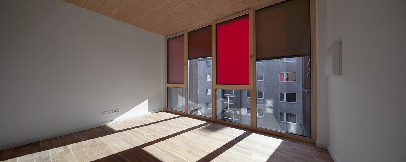 Il nuovo edificio si compone di cinque livelli, due unità per livello: uno studio + un’unità di 2 camere da letto che possono essere facilmente combinati in un'unica unità o divisi in 3 unità più piccole. Il profilo del tetto replica la condizione esistente degli edifici vicini. All’interno dell’edificio i solai sono realizzati con legno visibile nella parte inferiore in modo che il residente possa percepire il metodo di costruzione sostenibile e apprezzare l’atmosfera calda che crea il legno