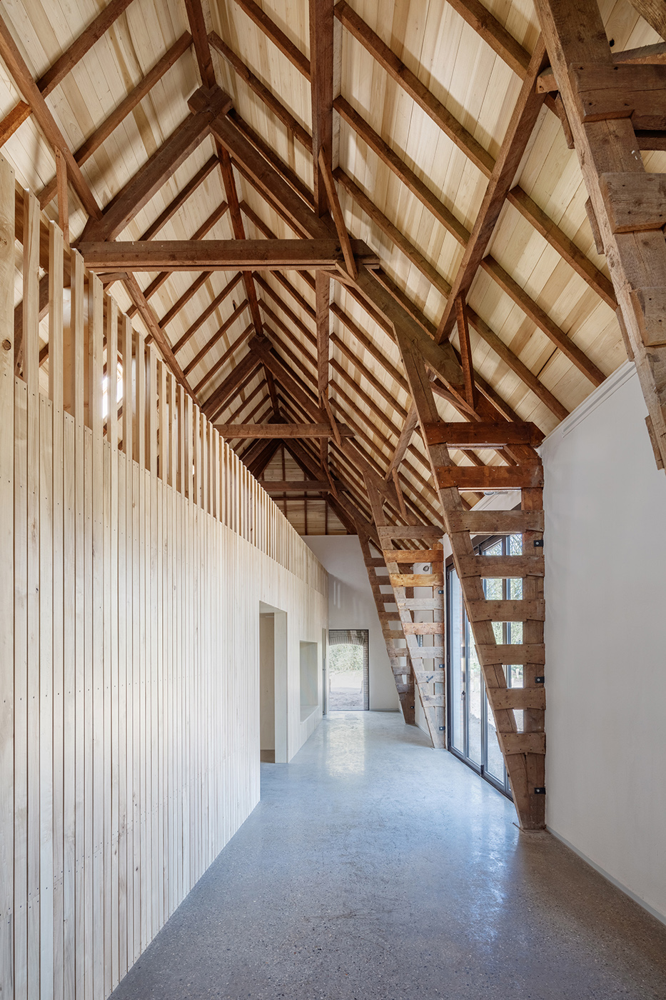 Le modifiche esterne al fienile sono limitate: ad eccezione dell'ingresso segnalato, il resto del fienile resta intatto. L'elemento nuovo più dominante è il delicato muro rifinito in legno. Le doghe in legno di pioppo in tre dimensioni sono disposte a ritmo continuo, in modo che la struttura verticale di sostegno della ringhiera rimanga fuori vista