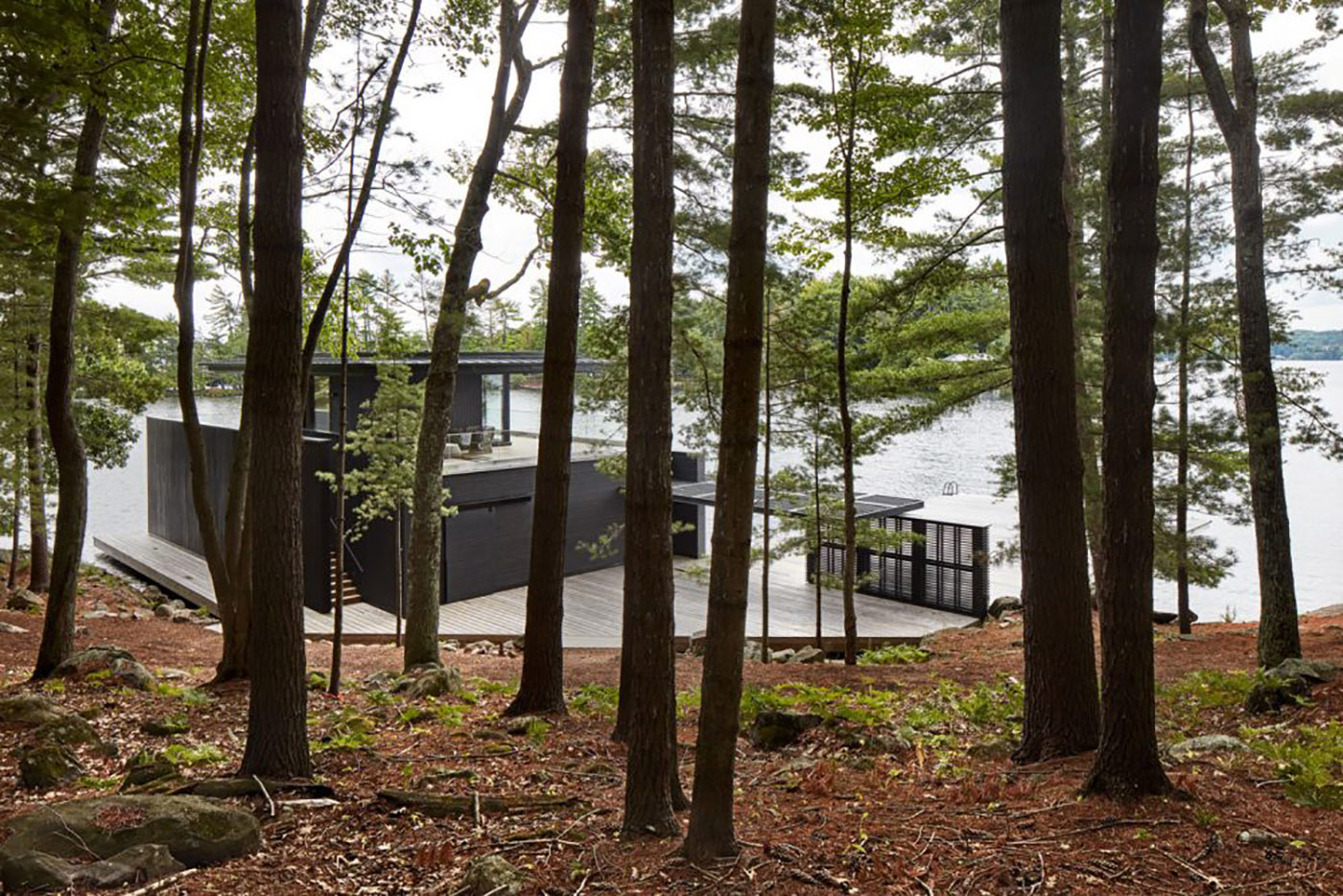 Questa struttura di 2.300 metri quadrati sul lago funge da suite per gli ospiti accanto a un cottage adiacente, con vista panoramica sul mare, sulle isole e sulla costa. Il rivestimento in legno di cedro fornito localmente è stato carbonizzato in un processo giapponese noto come Shou Sugi Ban per preservare il legno dagli agenti atmosferici naturali, fornendo una finitura esterna a bassa manutenzione