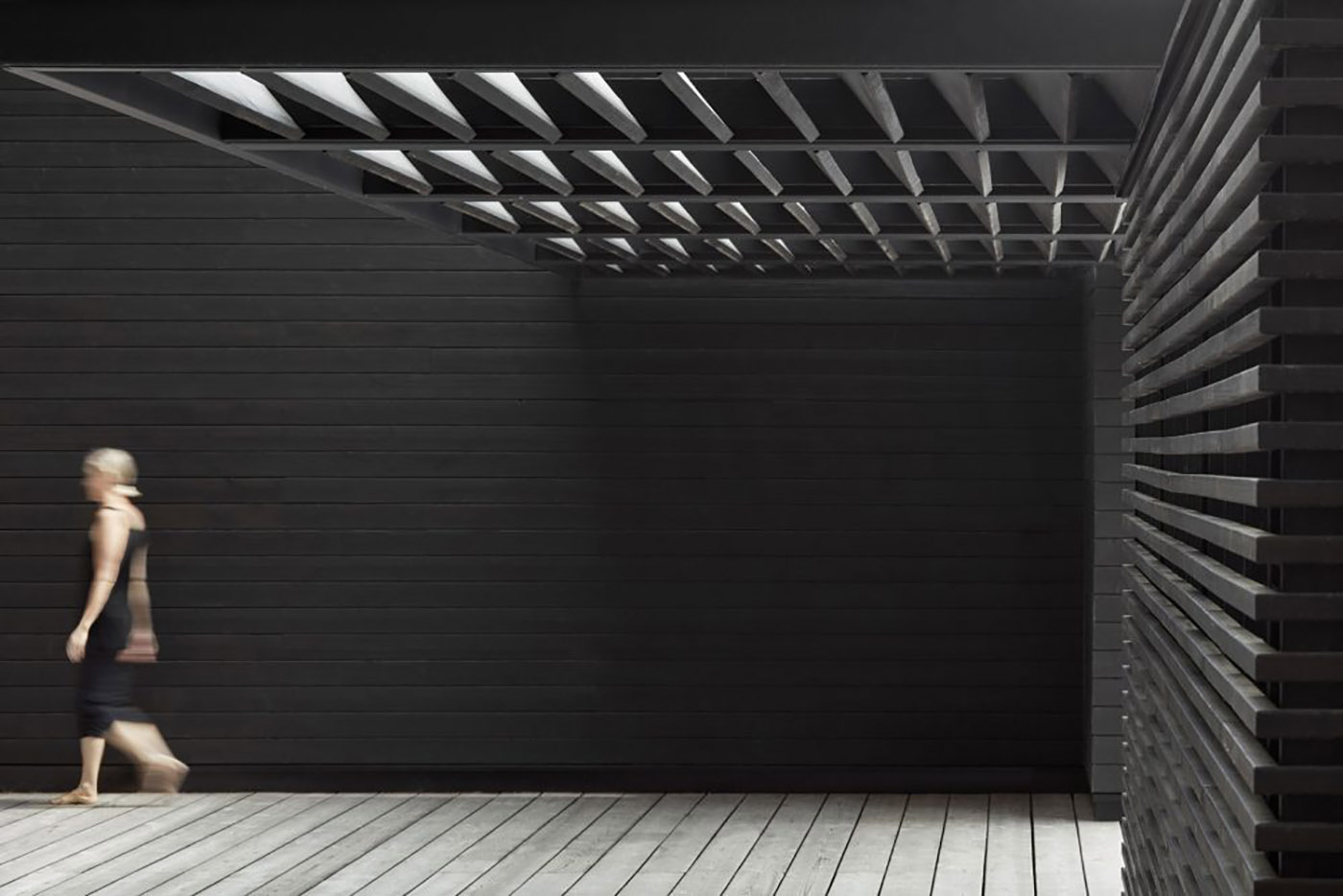 Boathouse in legno carbonizzato. Piani paralleli in legno costruiscono uno spazio etereo sulla riva del lago