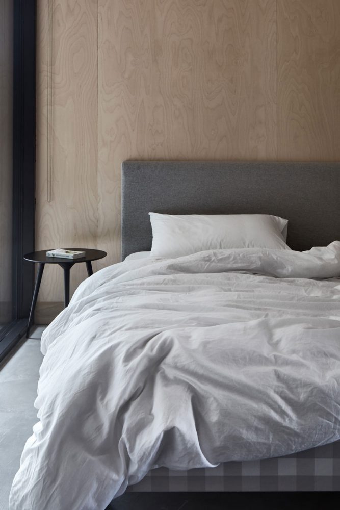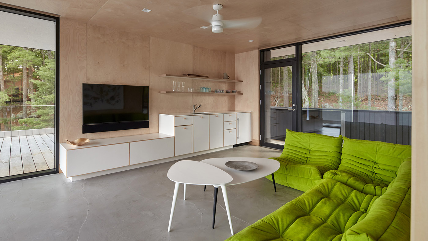 Una combinazione di legno compensato di betulla baltica e abete douglas avvolge le pareti interne e il soffitto. Un pavimento in cemento, al livello superiore, definisce lo spazio abitativo interno in contrasto con la pavimentazione in legno di cedro che presenta un campo altrimenti continuo in tutto.