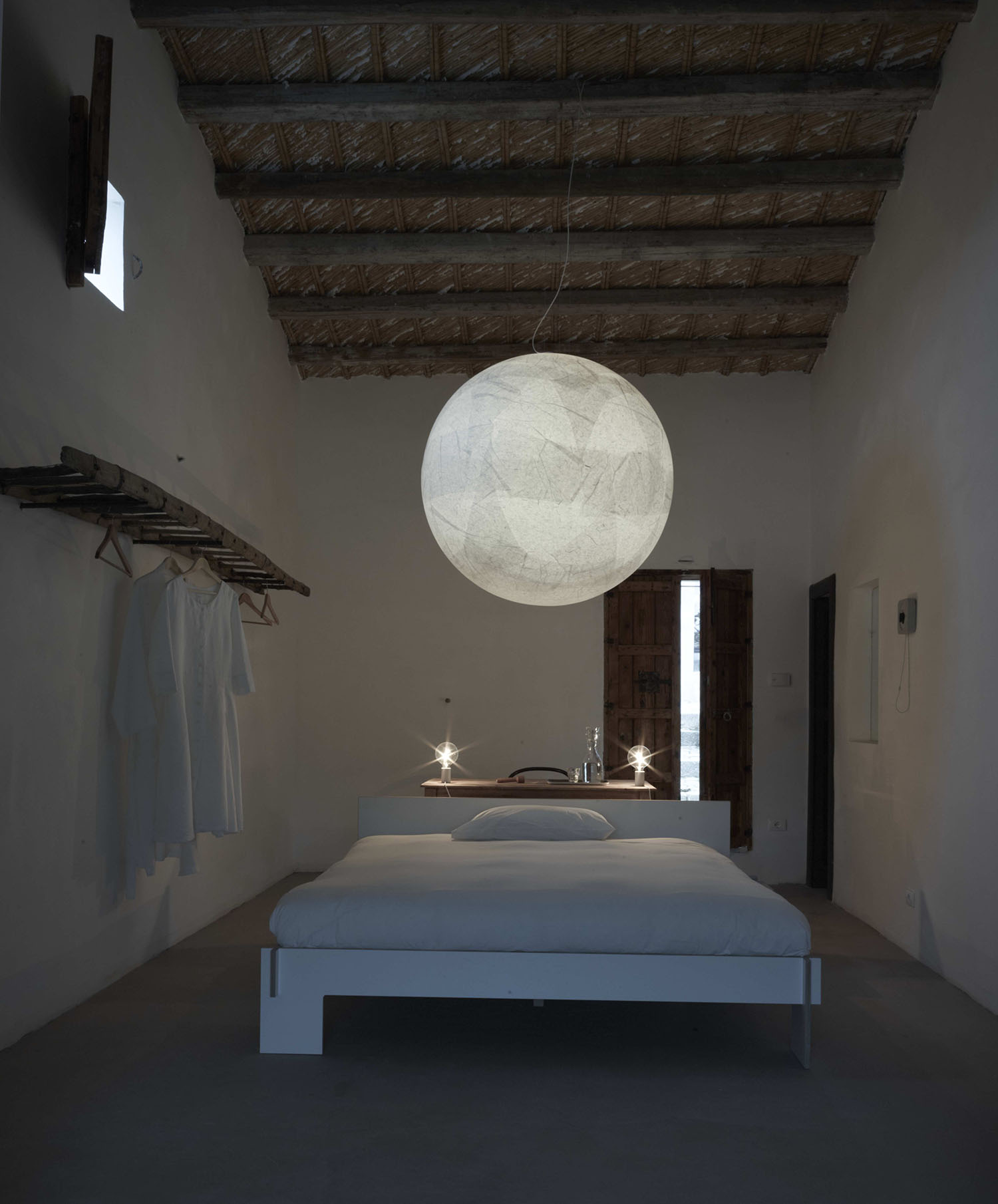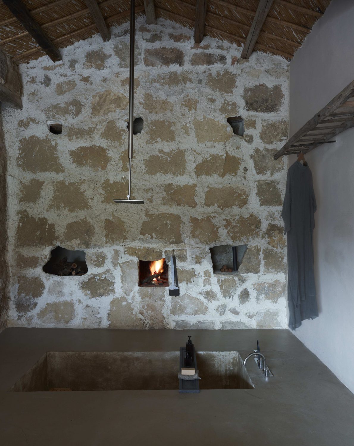 Il bianco del nuovo intonaco e il grigio del pavimento in cemento, elementi comuni all’intera superficie, si sovrappongono alla texture della pietra in un accostamento dove la concretezza del vecchio si fonde con la purezza e la regolarità di linee e volumi più attuali
