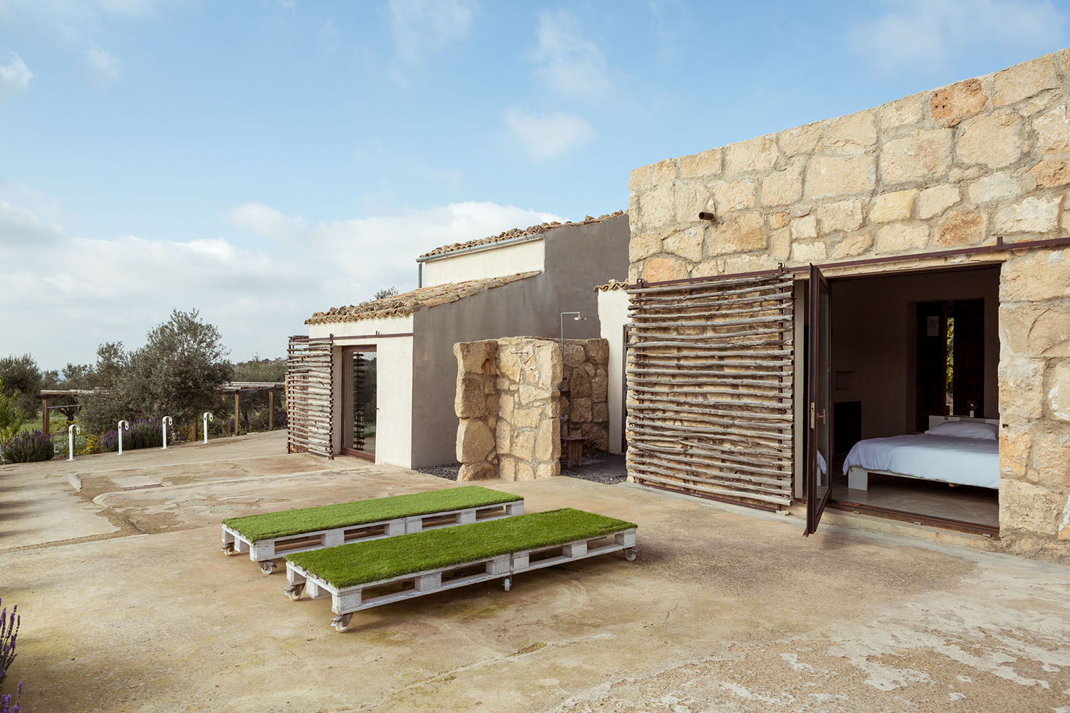 Gli spazi abitativi sono su due livelli differenti, affacciati, consuetudine delle dimore rurali siciliane, su un piccolo cortile. Nella parte più alta un susseguirsi di stanze, infilate una dopo l’altra. Il percorso inizia dall’antico palmento (luogo in cui si produceva il vino e si affumicava la ricotta) rimasto intatto nell’usura del tempo, che ospita il lungo bancone in acciaio della cucina. Poi la sala da pranzo, il soggiorno e la biblioteca. In ultimo si accede alla zona privata, studio, camera e bagno