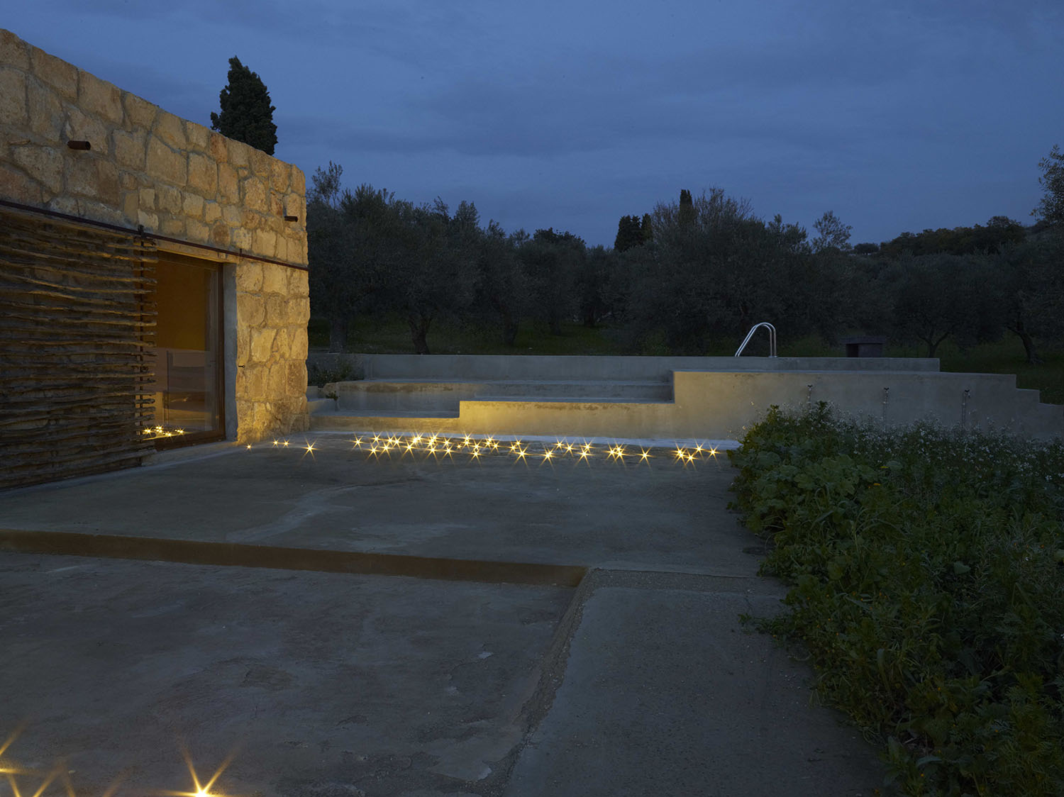 Interno ed esterno, zone dell’abitare e della natura, sono in relazione tra loro in modo da instaurare uno stretto legame tra ospite e territorio, orientando scorci e visuali sull’uliveto circostante, con vetrate verso l’aperta campagna. Componente fondamentale del progetto è il riappropriarsi del contatto con il paesaggio e conquistare l’orizzonte ancora libero