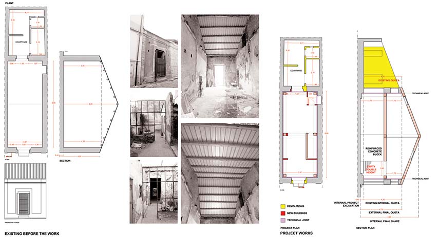 Il progetto di ristrutturazione della casa è curato dallo studio PRO.ARCH. e prevede estese opere di consolidamento dei muri perimetrali originali in pietra: l’unica parte dell’edificio sopravvissuto all’incendio che ne aveva causato la semidistruzione e l’abbandono. Una nuova struttura intelaiata in cemento armato viene posizionata all’interno delle mura pre-esistenti permettendo lo sviluppo di Casa SAVY