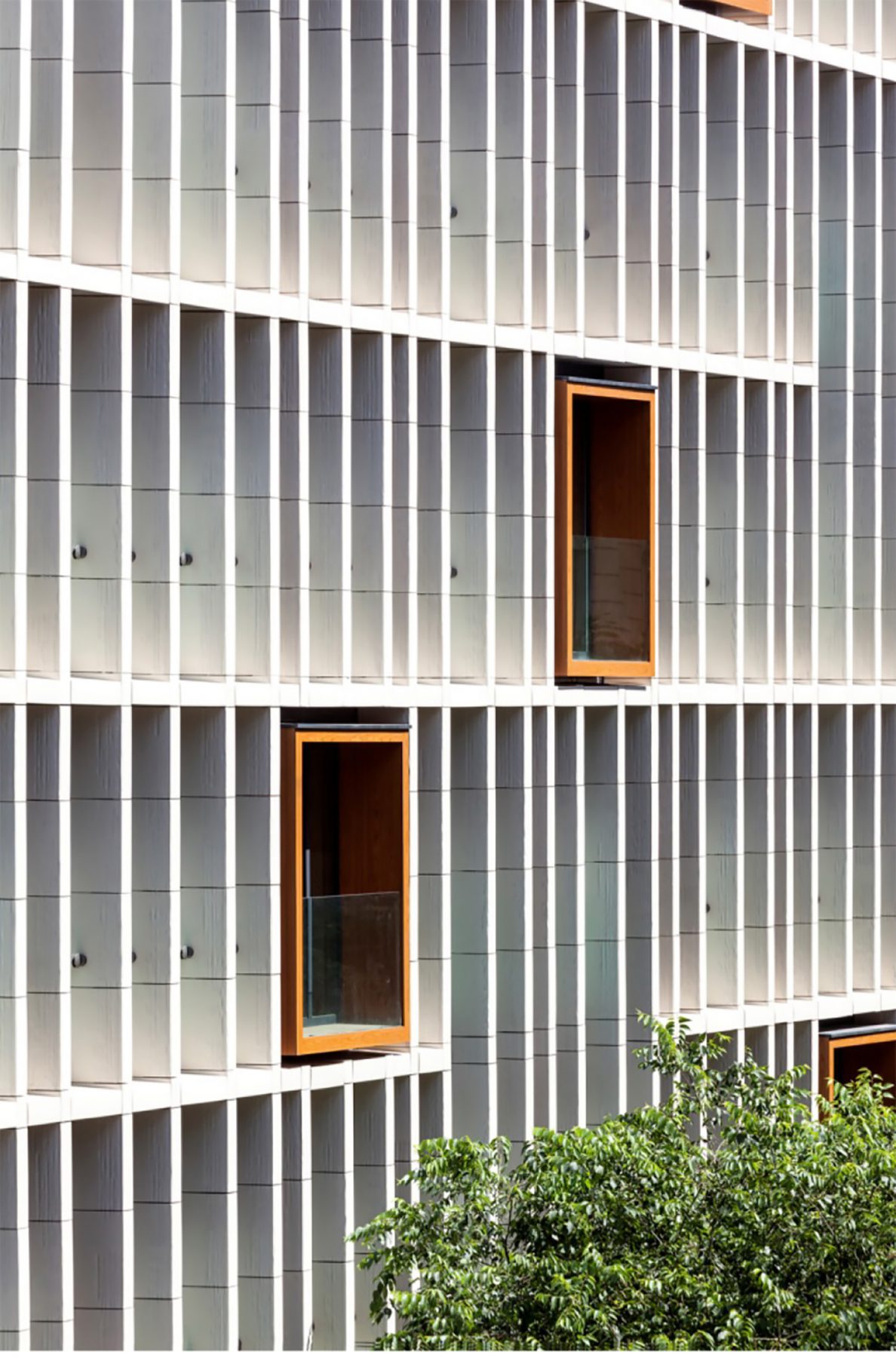 La facciata è composta da 800 pezzi di diverse dimensioni che compongono un vasto puzzle di moduli ceramici verticali che sfocano l'ordine e il numero di piani. La facciata ha anche cinque grandi telai in legno: sono in realtà dei balconi che spezzano le linee della facciata. Questo insieme grafico, tra ceramica e legno, movimenta la facciata, alta, che altrimenti sarebbe troppo monumentale e statica
