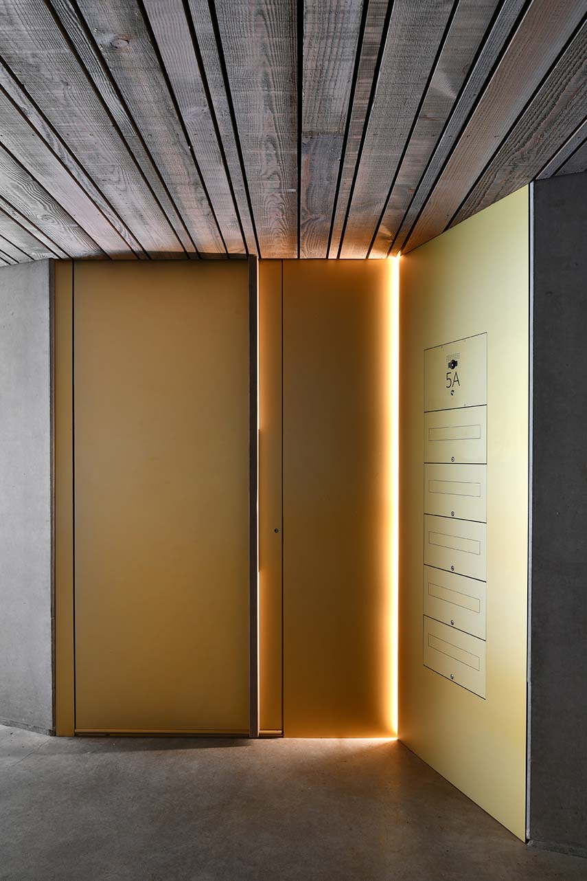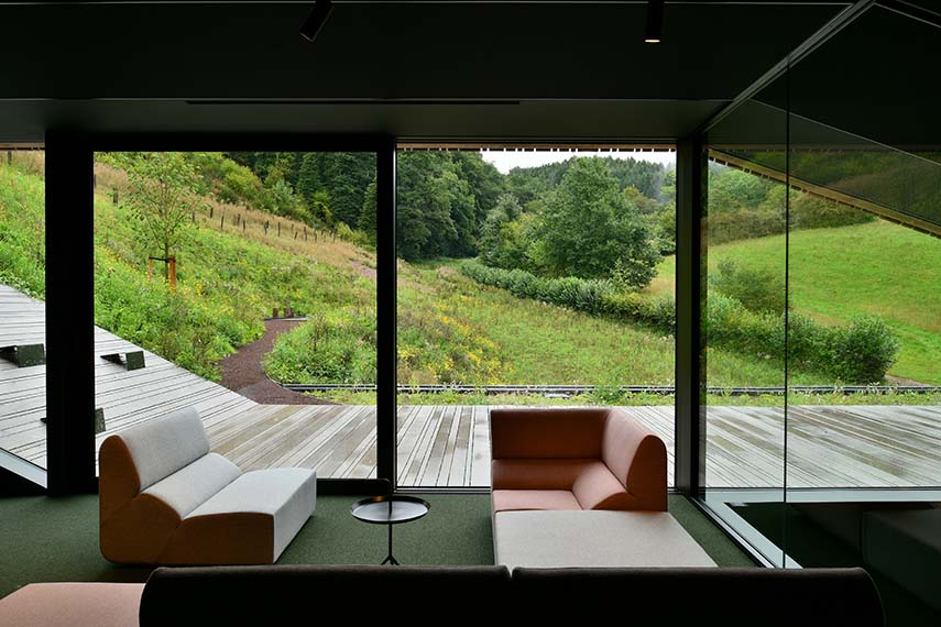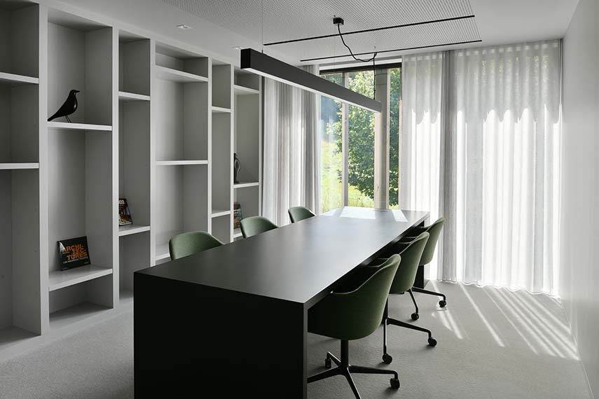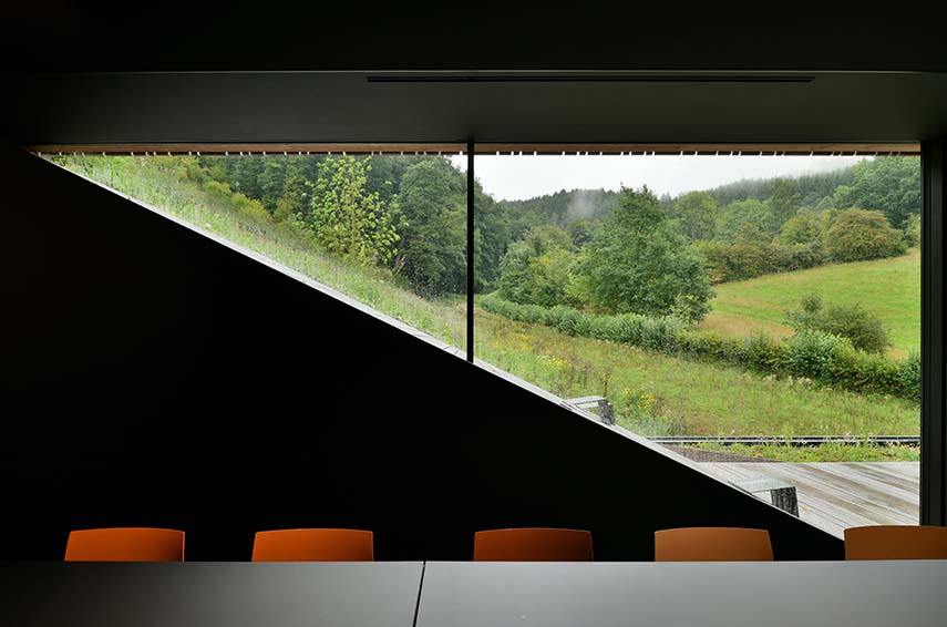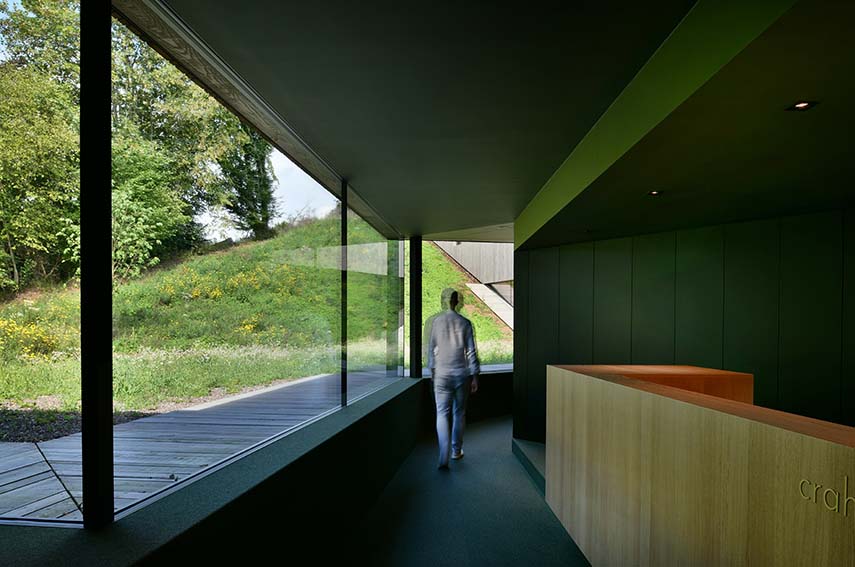 Il progetto della sede di crahayjamaigne nasce al confine tra urbanizzazione e natura, in un punto in cui la città si ritira e lascia spazio alla vegetazione. Il volume, dalla forma fluida e organica, si insinua nel terreno, scompare nella collina e si lascia attraversare dal paesaggio. L’accesso, discreto, è ottenuto da un taglio nel pendio che conduce all’ingresso coperto e al parcheggio interrato.