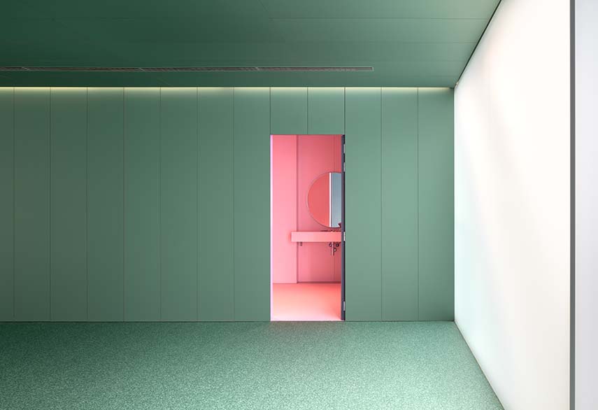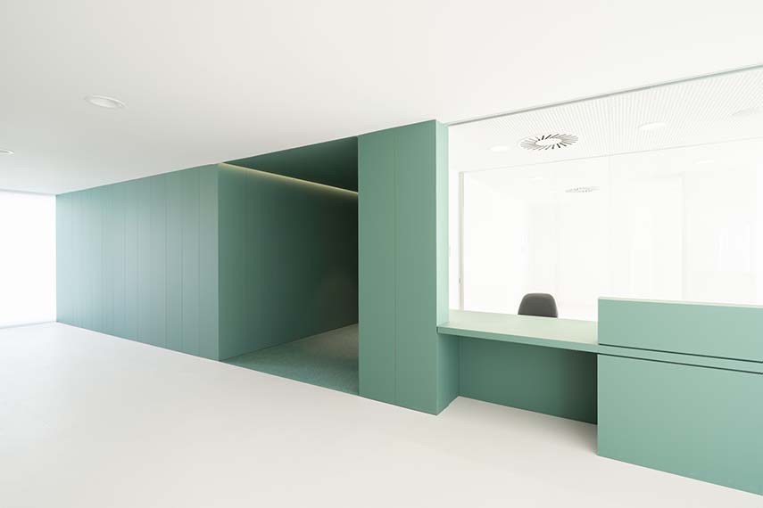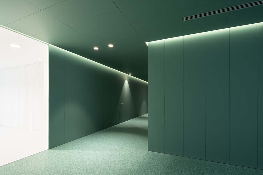 Uno degli obiettivi primari del progetto è stato quello di generare un'atmosfera più domestica e accogliente negli spazi di circolazione e attesa. Per raggiungere questo risultato, è stata proposta una palette di rivestimenti verdi e superfici vellutate, che integrano armoniosamente il ritmo delle porte delle stanze di consultazione. Questa scelta cromatica e materica migliora l'estetica degli spazi e contribuisce a creare un ambiente rilassante e tranquillo per i pazienti in attesa.