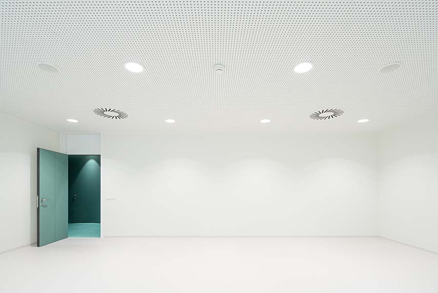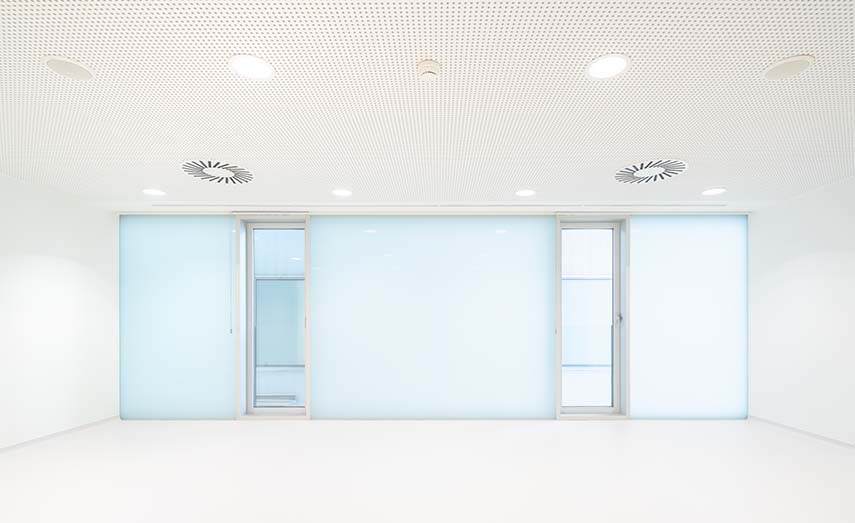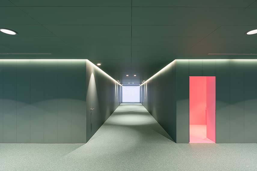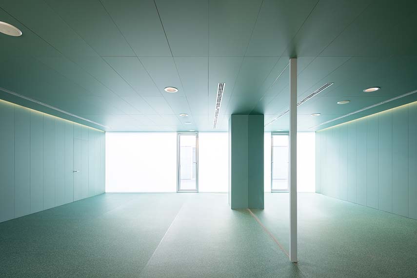 Il controllo dell'illuminazione, sia naturale che artificiale, è stato curato con particolare attenzione, con l'obiettivo di creare un'atmosfera calma e serena. Le sale di consultazione e trattamento, così come gli altri spazi di lavoro, sono caratterizzate da una gamma di bianchi che, insieme al rivestimento in vetro traslucido della facciata esistente, garantiscono una luminosità generosa e uniforme, ideale per le attività sanitarie.