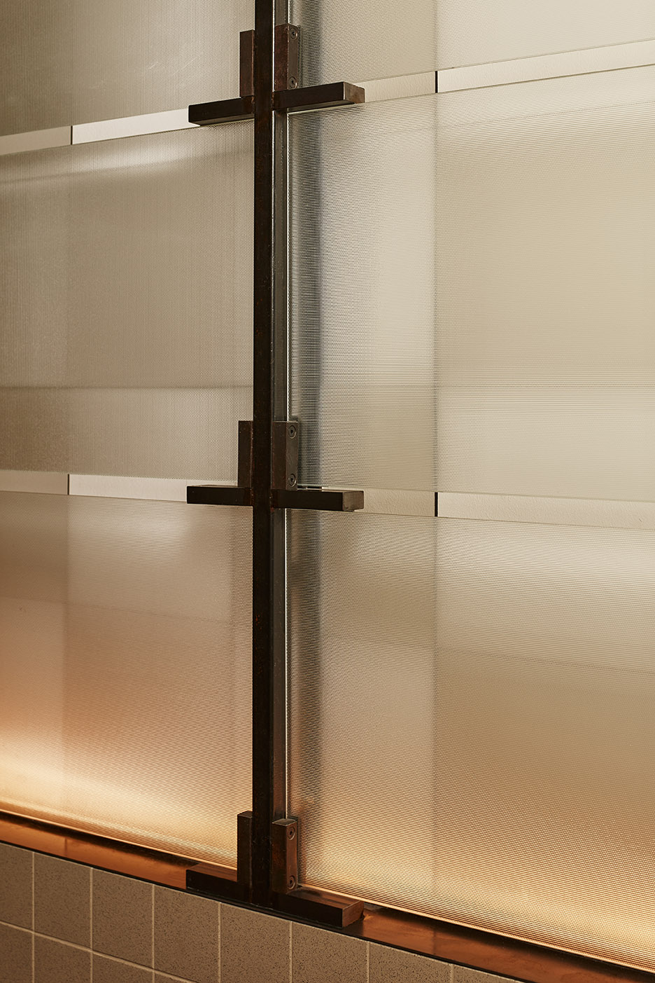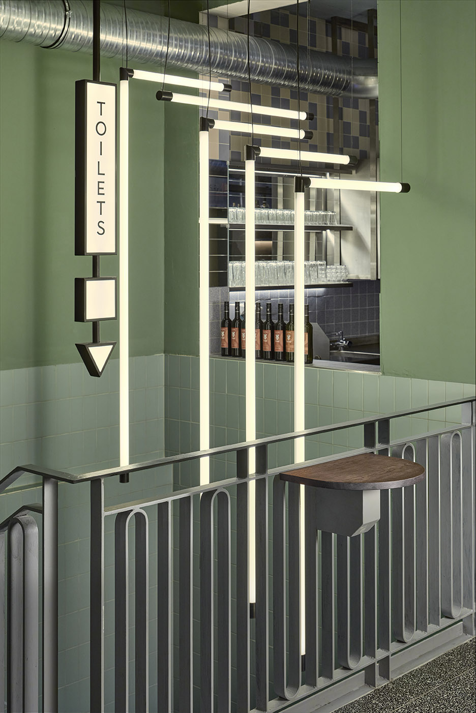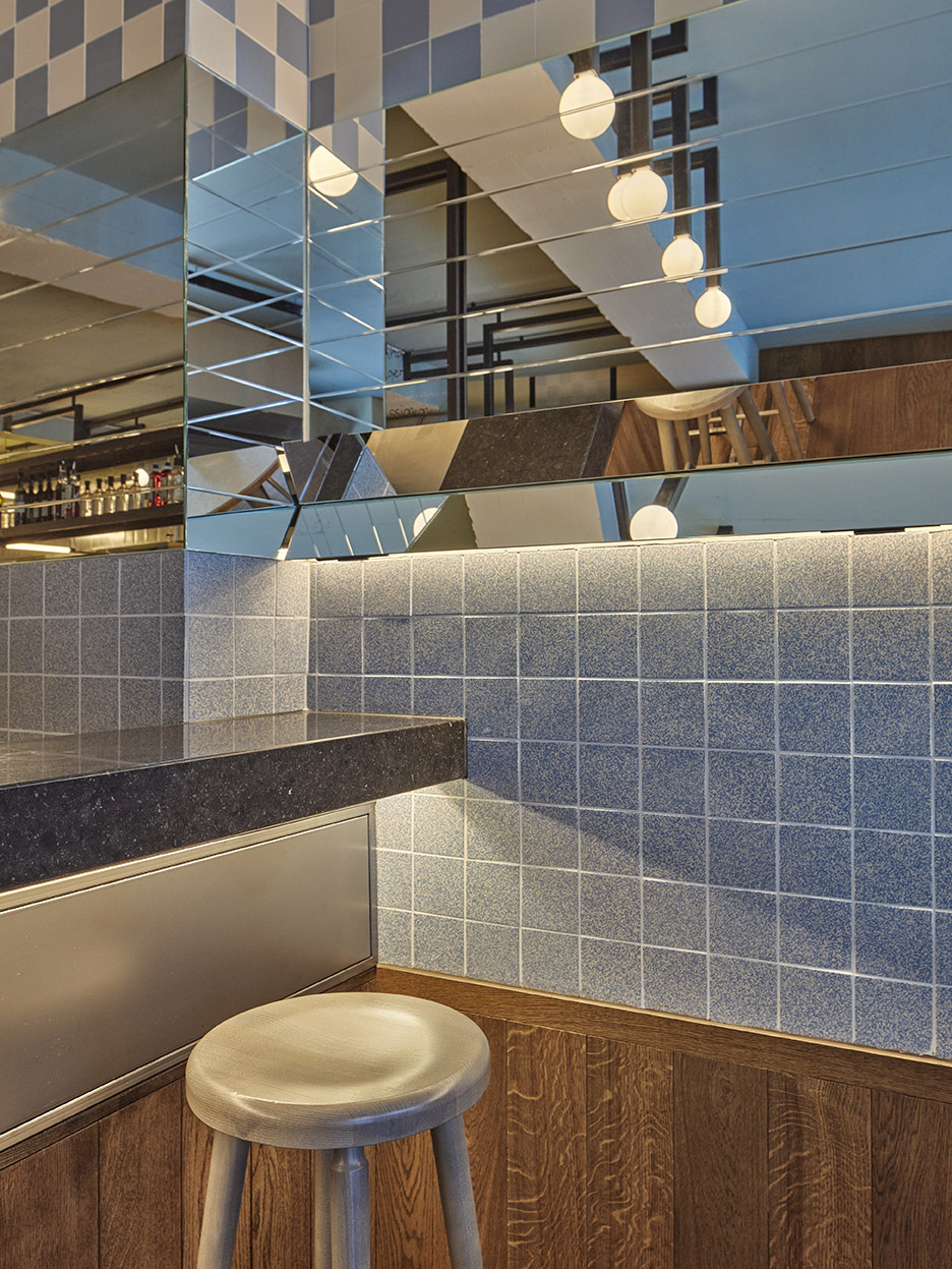 Il legame con il passato è già visibile all'interno della facciata: piastrelle blu ispirate ai vecchi interni abbracciano l'ingresso e si collegano visivamente con il logo di Otto. Il lettering, costruito con forme e profili semplici, collega l'esterno con l'interno, dove lo spazio è unificato dallo stesso linguaggio progettuale